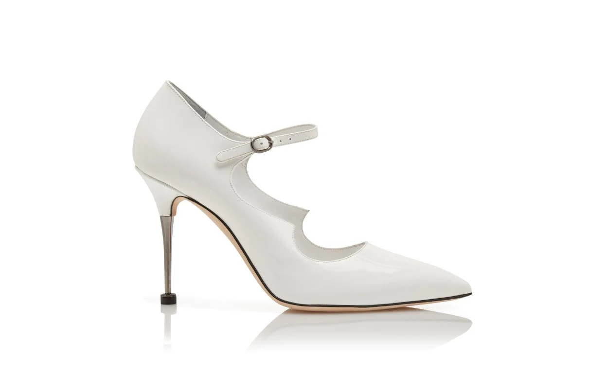 White patent leather pointed toe Mary Jane pumps featuring cut-out edging design and front strap with buckle closure. Finished with a stiletto high heel in a ruthenium finish. Upper:100% patent calf leather.Sole:100% calf leather.Lining:100% kid leather.Heel measures:105 mm.Italian sizing. Made in Italy. Product ID: 425-2061-0001