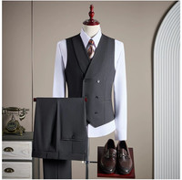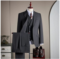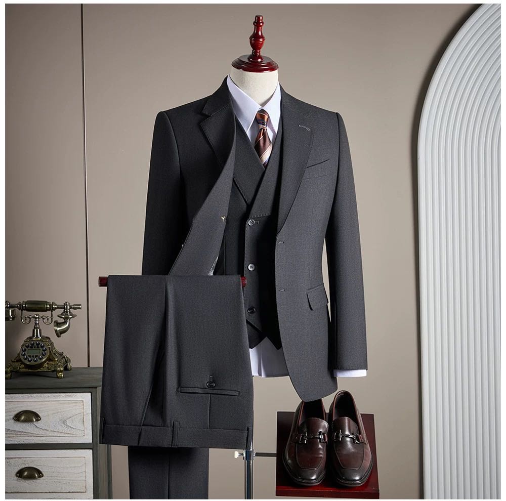 Men’s three-piece suit in a classic charcoal grey,tailored in a clean and timeless fit. The color is understated and professional, easy to style and suitable for a wide range of formal occasions. Includes a structured single-breasted blazer, matching trousers, and a fitted vest that adds depth and polish to the overall look. Sharp lines and balanced proportions create a refined silhouette without feeling tight or restrictive. Worn only for display or fitting. No stains, no damage, excellent condition. Ideal for business meetings, interviews, weddings, and formal events.