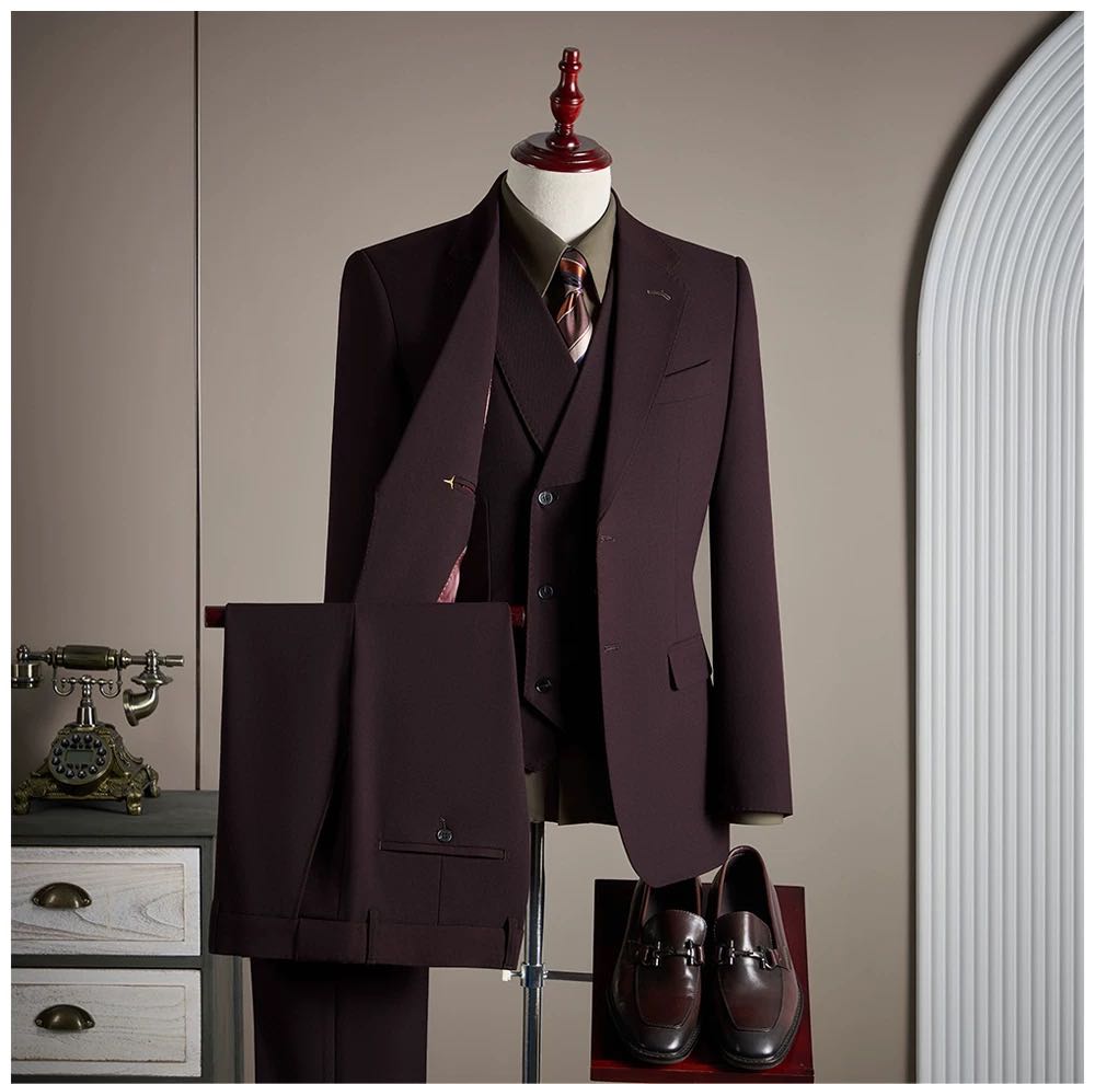 Men’s three-piece suit in a rich deep burgundy / wine color, classic tailored fit. The color is elegant and distinctive—subtle under indoor light, refined and confident in natural light. Features a structured blazer with clean lapels, matching trousers, and a coordinating vest that adds depth and formality to the look. Sharp lines and a well-balanced silhouette create a polished appearance without being overly slim. Worn only for display or fitting. No stains, no damage, excellent condition. Ideal for weddings, formal events, evening occasions, or business settings where you want to stand out with understated sophistication.