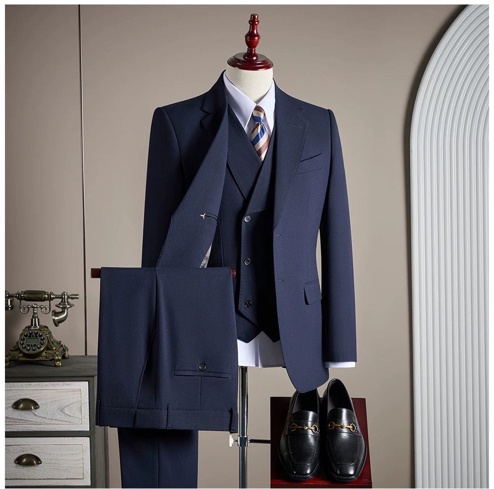Men’s three-piece suit in a classic navy blue,brand new. The color is clean, refined, and versatile—perfect for both formal and professional settings. Includes a structured single-breasted blazer, matching trousers, and a tailored vest that adds depth and elegance to the overall look. The silhouette is sharp and well-balanced, offering a polished appearance without feeling overly slim. Brand new, never worn. No stains, no damage, in pristine condition. Ideal for business occasions, weddings, formal events, and important meetings.