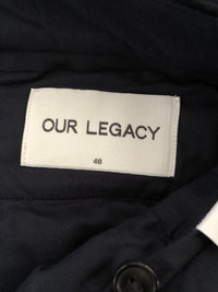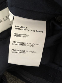 The Swedish brands 10th anniversary sees the launch of their 'Ten' collection,garments encompassing styles that signify their past, present and future. The Our Legacy's Classic Trouser in Soft Navy Wool Twill is produced in an Italian fabric that features a slightly tapered leg, zip fly, two side pockets, flap pocket closure on right back pocket and loop tab closure on left. * 'Ten' Collection * Italian Fabric Origin * Virgin Wool Blend * Tapered Leg * Zip Fly * Two Angled Front Pockets * Two Button Closed Rear Pockets Size 48 = M = 32”