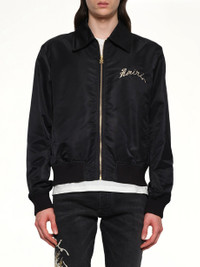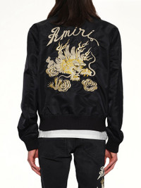 Amiri's AMIRI Dragon Nylon Bomber in Black is a striking piece that combines modern style with intricate detailing. This bomber jacket features a bold dragon motif, making it a standout addition to any wardrobe. - Composition: 100% PA - Bold dragon embroidery on the back - Classic bomber silhouette - Ribbed cuffs and hem for a snug fit - Front zip closure - Side pockets for added functionality - Made in Italy Model is 187 cm and wears size 48 SKU: AMOUBB1059 001