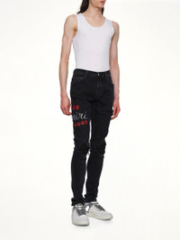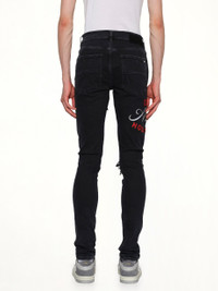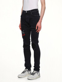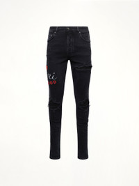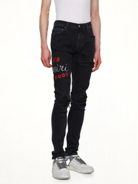 Amiri's Club Amiri MX1 Jean in Dust Black is a stylish and edgy addition to any wardrobe. These jeans feature a unique design that combines modern aesthetics with a classic fit. - Composition: 92% COTTON, 6% EME, 2% EA - Distinctive dust black color for a bold look - Signature Amiri detailing and craftsmanship - Comfortable fit with a contemporary silhouette - Perfect for casual and semi-formal occasions - Made in Italy Model is 187 cm and wears size 32 SKU: AMDNSY1168 635