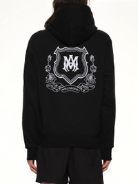 Amiri's MA Crest Zip Hoodie in Black is a stylish and versatile addition to any wardrobe. This hoodie combines comfort with a sleek design, making it perfect for casual outings or layering. - Composition: 100% Cotton - Features a full zip closure for easy wear - Embellished with the signature MA crest on the chest - Includes adjustable drawstring hood for a personalized fit - Equipped with front pockets for added convenience - Designed with ribbed cuffs and hem for a snug fit - Made in Italy Model is 187 cm and wears size M SKU: AMJYHD1126 001