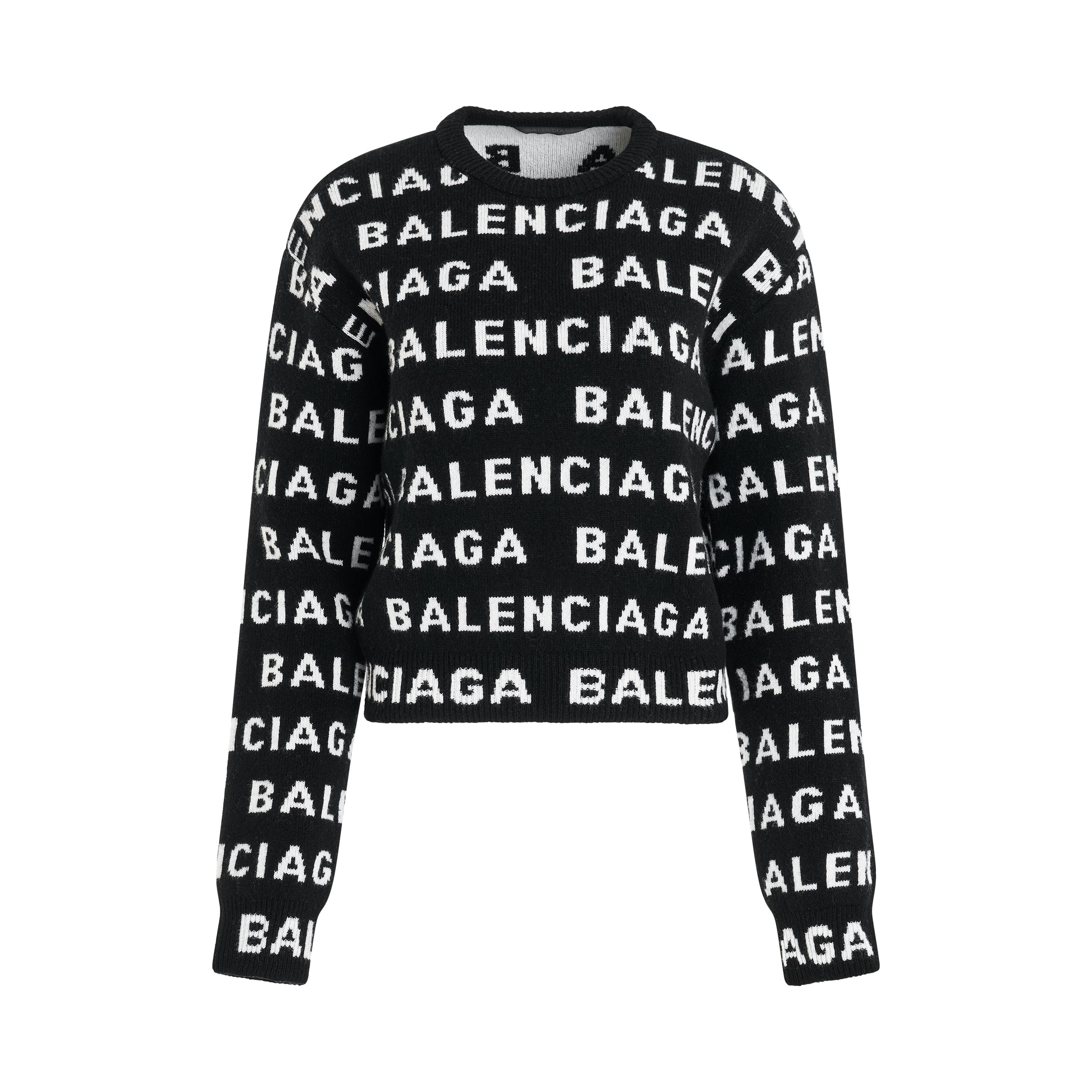 Feel stylish and comfortable in our All-Over Logo Cropped Sweater. Made in classic black and white, the sweater features our iconic logo, giving it a timeless and versatile look. A perfect addition to any wardrobe. - Composition: 98% Wool, 2% Polyamide - Intarsia-knit logo - Crew neck - Drop shoulder - Long sleeves - Ribbed cuffs and hem SKU: 761591T16731070