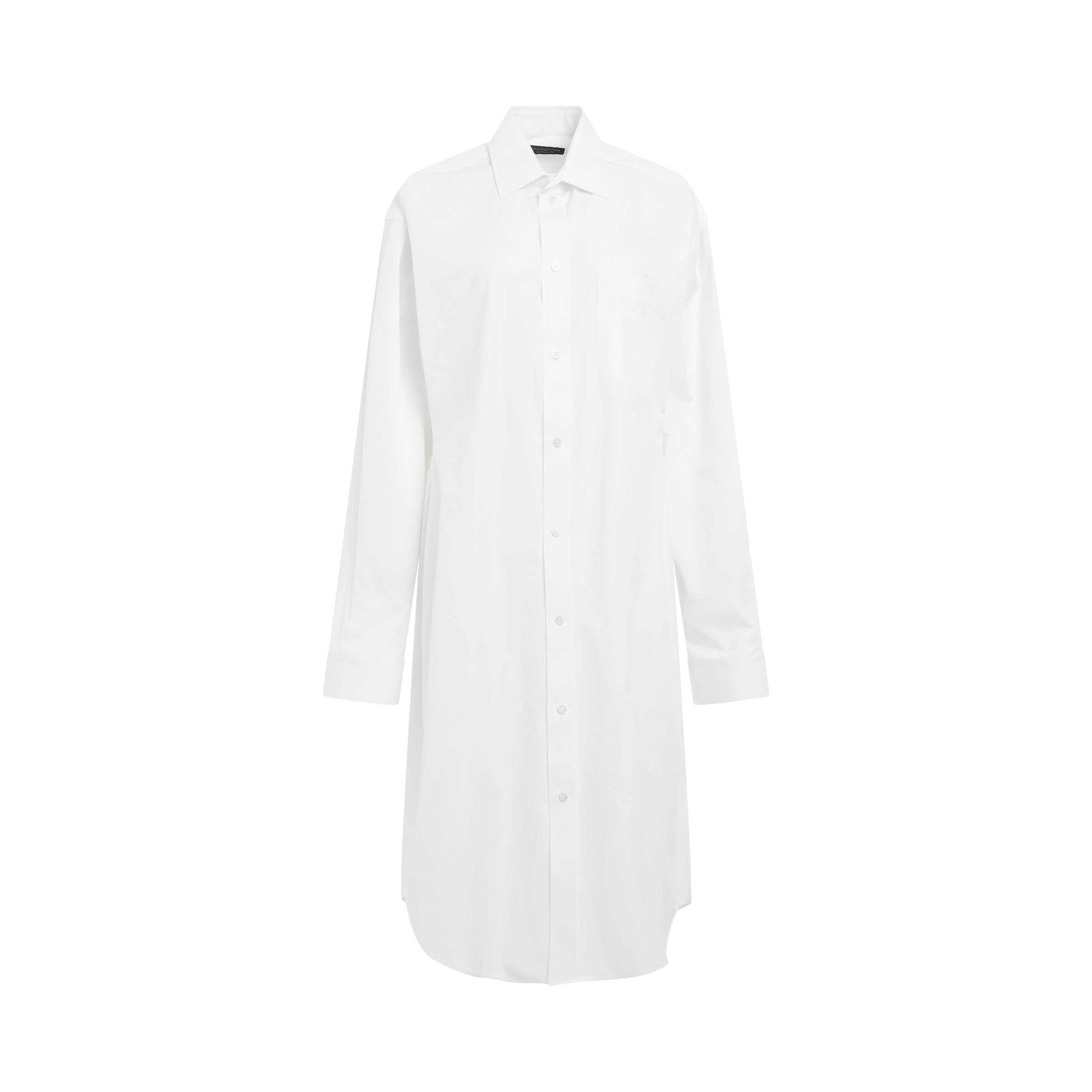Balenciaga's white Hourglass midi shirt dress showcases the brand's signature minimalist aesthetic. Crafted meticulously tailored from crisp cotton poplin. The dress features clean lines and a structured silhouette, accentuated by a classic point collar. - Composition: 100% Cotton - Relaxed cut shoulder - Front button closure - Long sleeves - Point collar - Curved hem SKU: 746146TNM609000