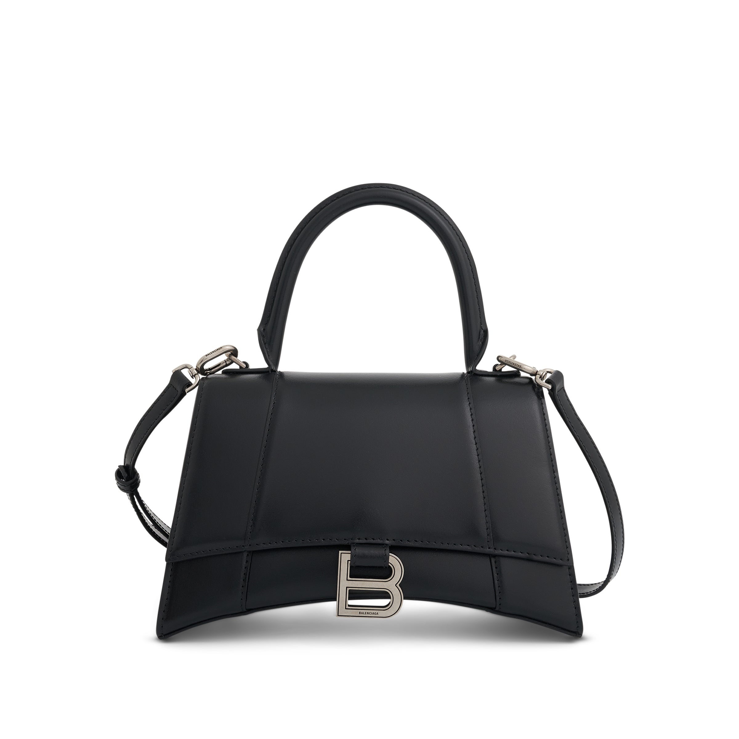 Hourglass XS Handbag in Box Calfskin in Black with Silver Plaque