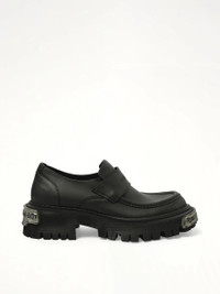 Balenciaga's Tractor Loafer L20 in Black/Silver is a bold statement piece that combines modern design with classic elegance. Perfect for any occasion, this loafer offers both style and comfort. - Composition: Calfskin/Abs Acc+Worn Out - Distinctive black and silver colorway - Chunky sole for added height and comfort - Premium leather construction - Signature Balenciaga branding - Versatile design suitable for various outfits SKU: 825735WBSA81010