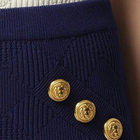 Expertly crafted with a comfortable vichy knit fabric, this short skirt boasts 6 stylish buttons and a classic midnight blue color. Perfect for any occasion, add a trendy flair to your wardrobe with this must-have piece. - Composition: 84% Viscose, 16% Polyester - Diamond pattern - Elasticated waistband - Embossed gold-tone buttons - Faux pocket detail - Thigh-length - Made in France Model is 175 cm and wears size 36 SKU: LB196KH60 6BO