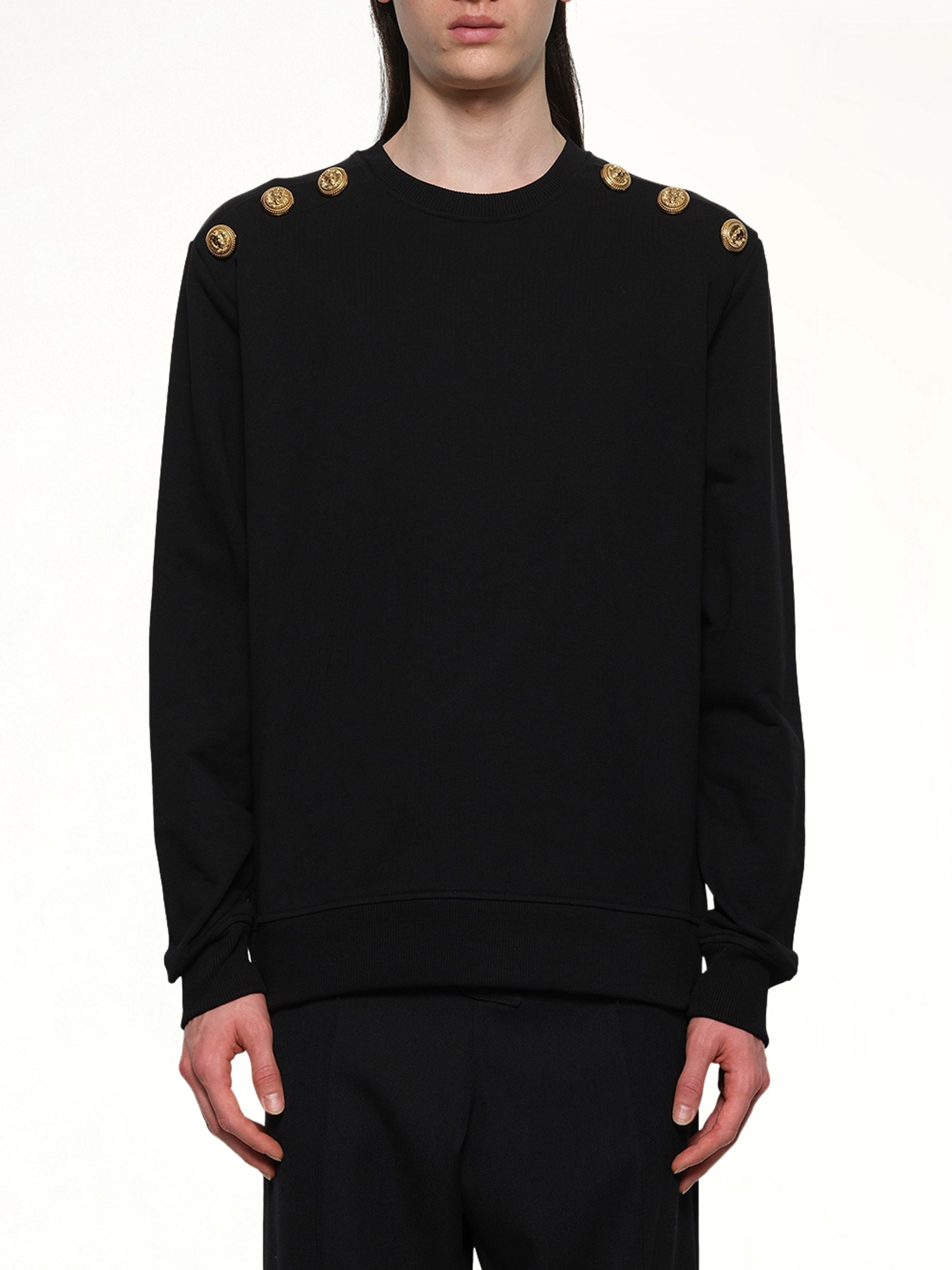 Balmain's 6 Shoulder Button Sweatshirt in Black is a stylish and versatile piece that combines comfort with a touch of luxury. This sweatshirt features signature detailing that elevates any casual outfit. - Composition: 100% Organic Cotton - Classic black color for versatile styling - Distinctive six-button detailing on the shoulder - Relaxed fit for everyday comfort - Ribbed cuffs and hem for a snug fit - Iconic Balmain branding - Made in France Model is 187 cm and wears size M SKU: JS155JB13 0PA