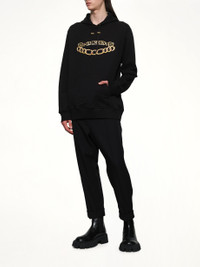 Balmain's Balmain Chian Logo Hoodie in Black/Gold is a stylish and luxurious addition to any wardrobe. This hoodie combines comfort with a bold design, making it perfect for both casual and upscale occasions. - Composition: 100% Organic Cotton - Features a striking gold logo on the front - Crafted with a comfortable and relaxed fit - Drawstring hood for adjustable coverage - Ribbed cuffs and hem for a snug fit - Available in a classic black color - Made in France Model is 187 cm and wears size M SKU: JT047GE97 EAD