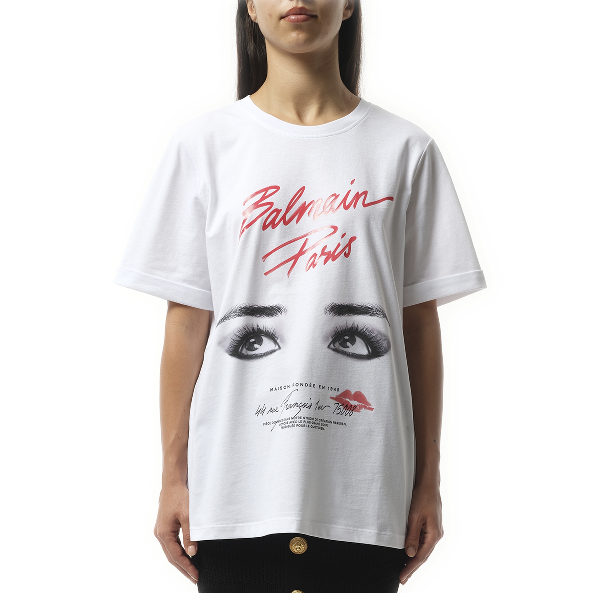 Balmain's Paris Eyes Print T-Shirt in White showcases a bold and artistic graphic with a distinctive modern edge. The statement print blends creative expression with Balmain’s signature luxury finish. A standout addition to elevate any casual or streetwear-inspired look. Composition: 100% Organic Cotton Short sleeves and ribbed crew neckline Regular fit with comfortable wear Front graphic featuring stylised eyes and "Balmain Paris" text Pullover style Made in Portugal Model is 175 cm and wears size S. SKU: EF0EF145GE90 GRR