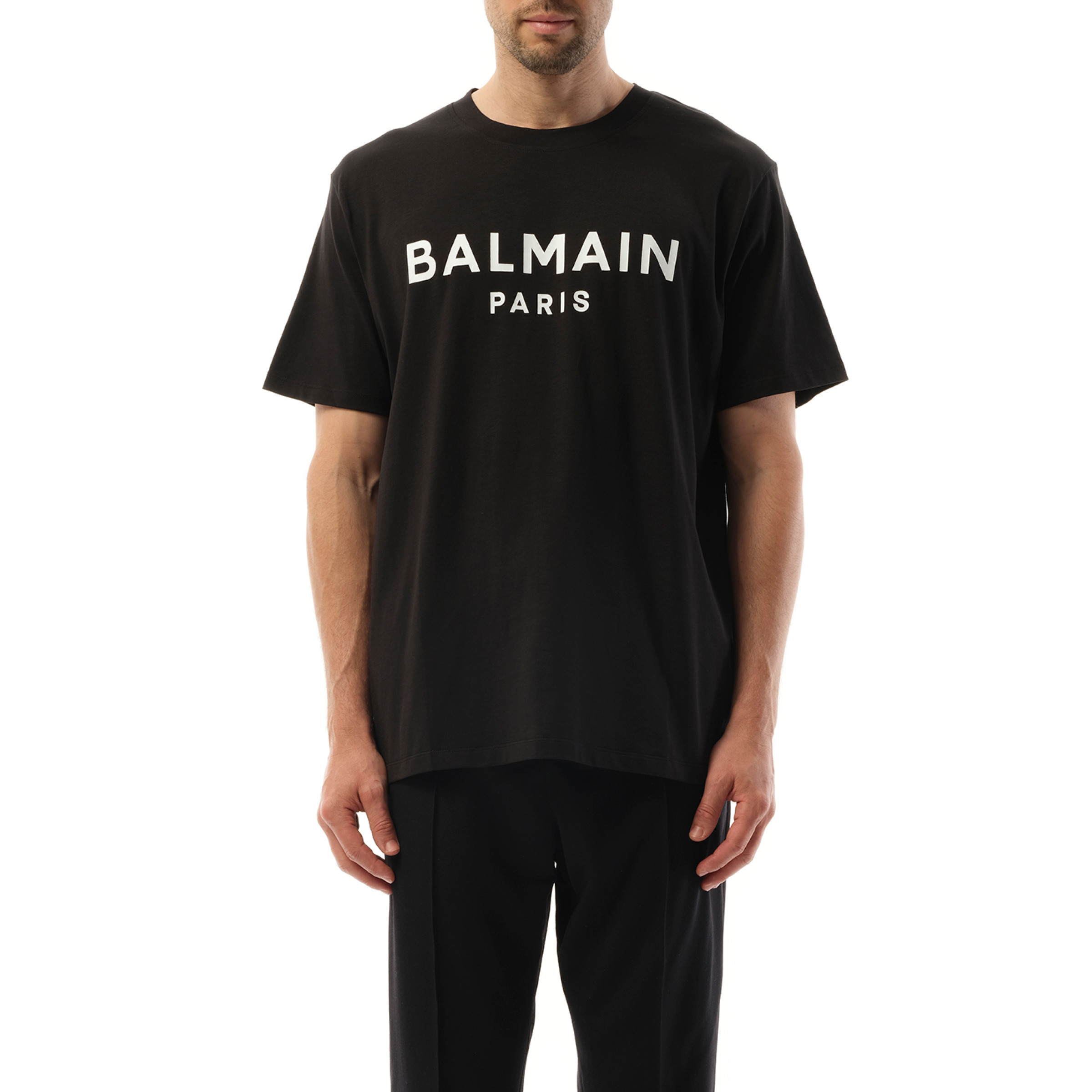 This Balmain Print Reg Fit T-Shirt combines comfort and style with its regular fit and bold black and white design. Made by a reputable fashion brand, it's perfect for making a statement while still looking effortlessly cool. - Composition: 100% Cotton - Round neck - Ribbed trim - Short sleeves - Logo printed on the front - Regular fit - Made in France Model is 192 cm and wears size M SKU: EG010BB73 EAB