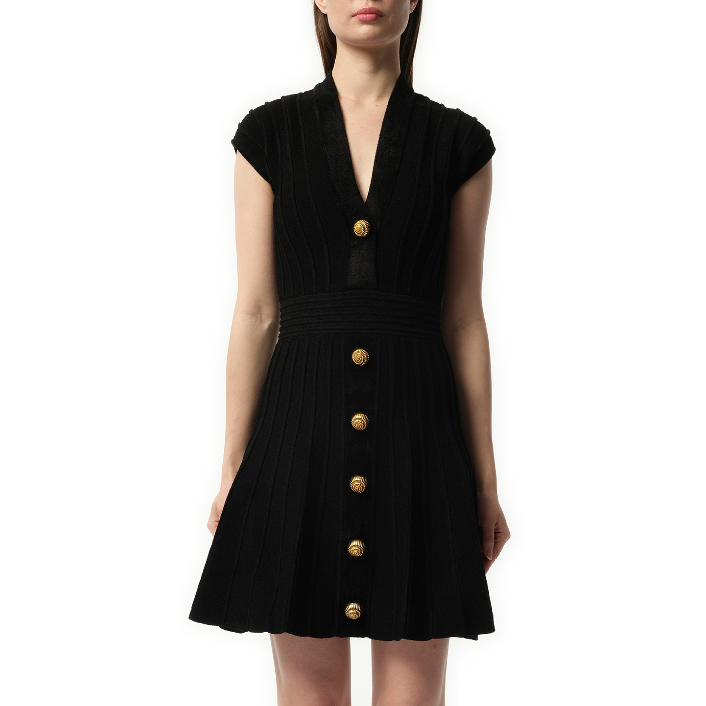 Expertly crafted with a flattering button V-neck and luxurious velvet fabric, this black flare short dress is the perfect mix of sophistication and style. Dress it up for a special occasion or dress it down for a casual day out. - Composition: 80% Viscose, 14% Polyester, 6% Polyamide - Embossed gold-tone buttons - Front button fastening - Short sleeves - Fitted waistline - Flared skirt - Made in France Model is 175 cm and wears size 36 SKU: R7086KH64 0PA