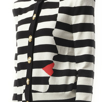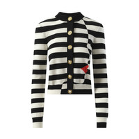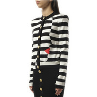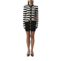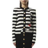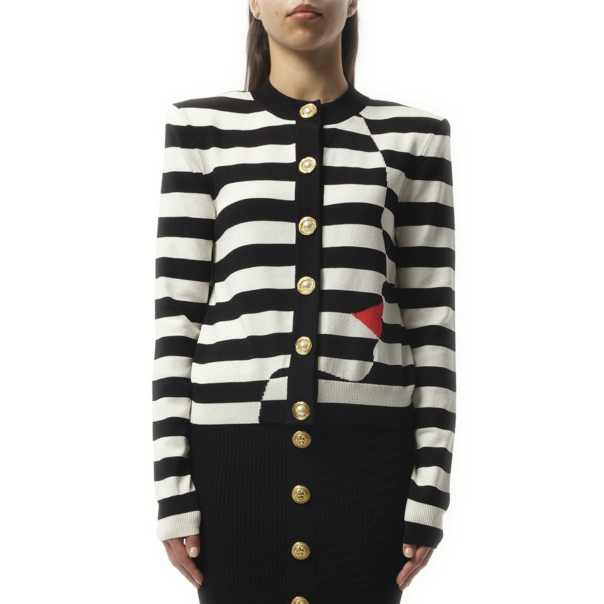 Balmain's Buttoned Face Mariniere Knit Cardigan in Black/White combines classic nautical stripes with distinctive artistic elements. The eye-catching face motif and gold-tone buttons add a unique flair to this elegant piece. An ideal choice for elevating both casual and sophisticated outfits. Composition: 85% Viscose 15% Polyester Features a round neckline and structured shoulders for a tailored look Long sleeves with ribbed cuffs enhance the refined design Embellished with six gold-tone and pearl buttons on the front Cropped slim fit that complements various styles Made in Italy Model measures 175 cm and wears size 36. SKU: EF0KL133KI32 EJR