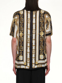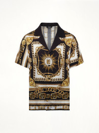Balmain's Foulard Print Shirt in Black/White/Gold is a striking piece that combines classic elegance with modern flair. This shirt features a bold foulard print that makes a statement in any setting. - Composition: 100% Viscose - Color: Black/White/Gold - Bold foulard print design - Button-down front closure - Long sleeves with buttoned cuffs - Classic collar - Made in France Model is 187 cm and wears size M SKU: HN150VI41 EDC