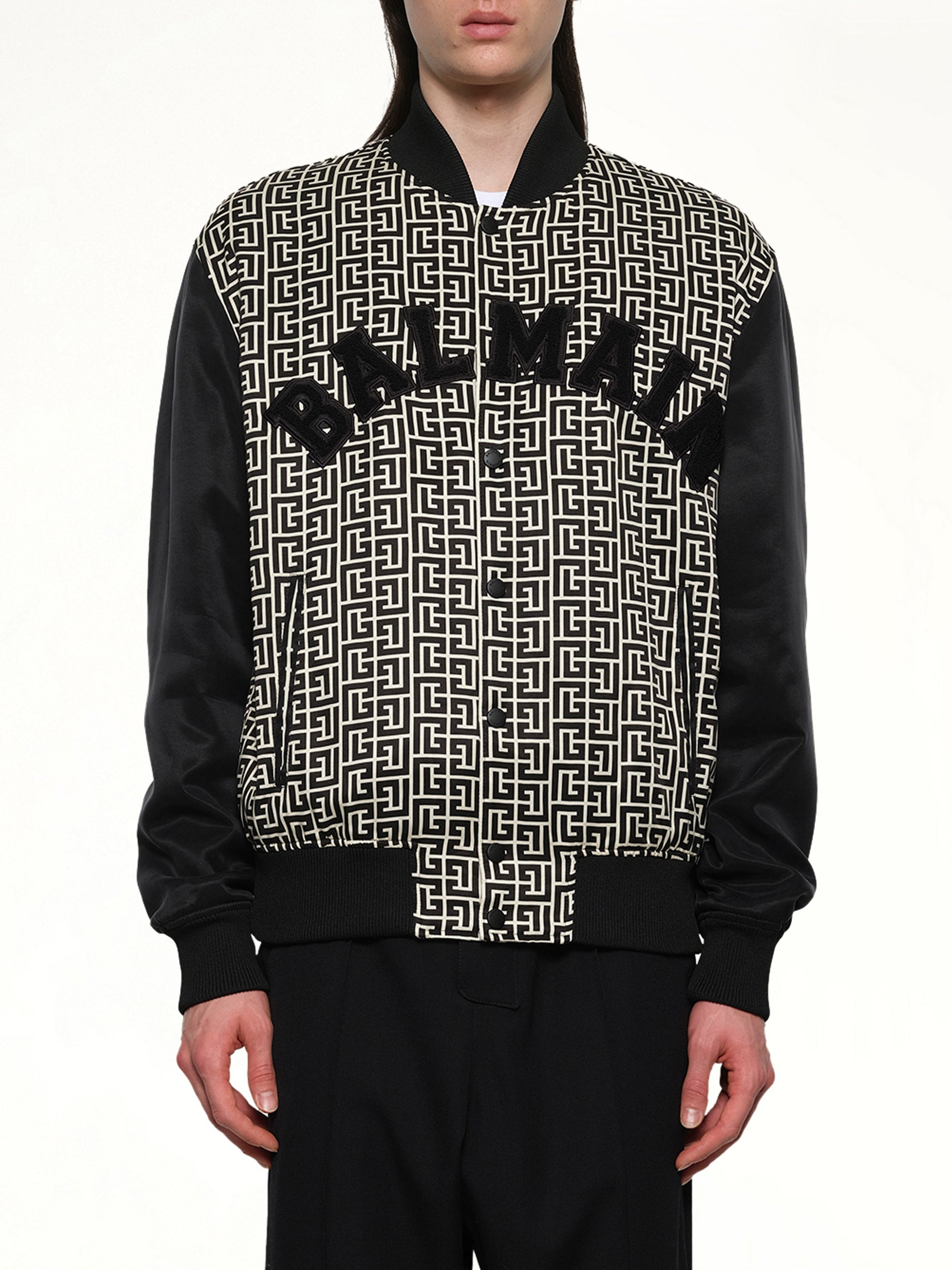 Balmain's Monogram Varsity Jacket in Black/White is a stylish blend of classic varsity design and modern luxury. This jacket features the iconic Balmain monogram, offering a bold statement piece for any wardrobe. - Composition: 100% Cupro - Classic varsity jacket silhouette - Black and white color scheme - Iconic Balmain monogram detailing - Ribbed cuffs and hem for a snug fit - Front button closure - Side pockets for convenience - Made in France Model is 187 cm and wears size 48 SKU: TFA40MH62 EDK