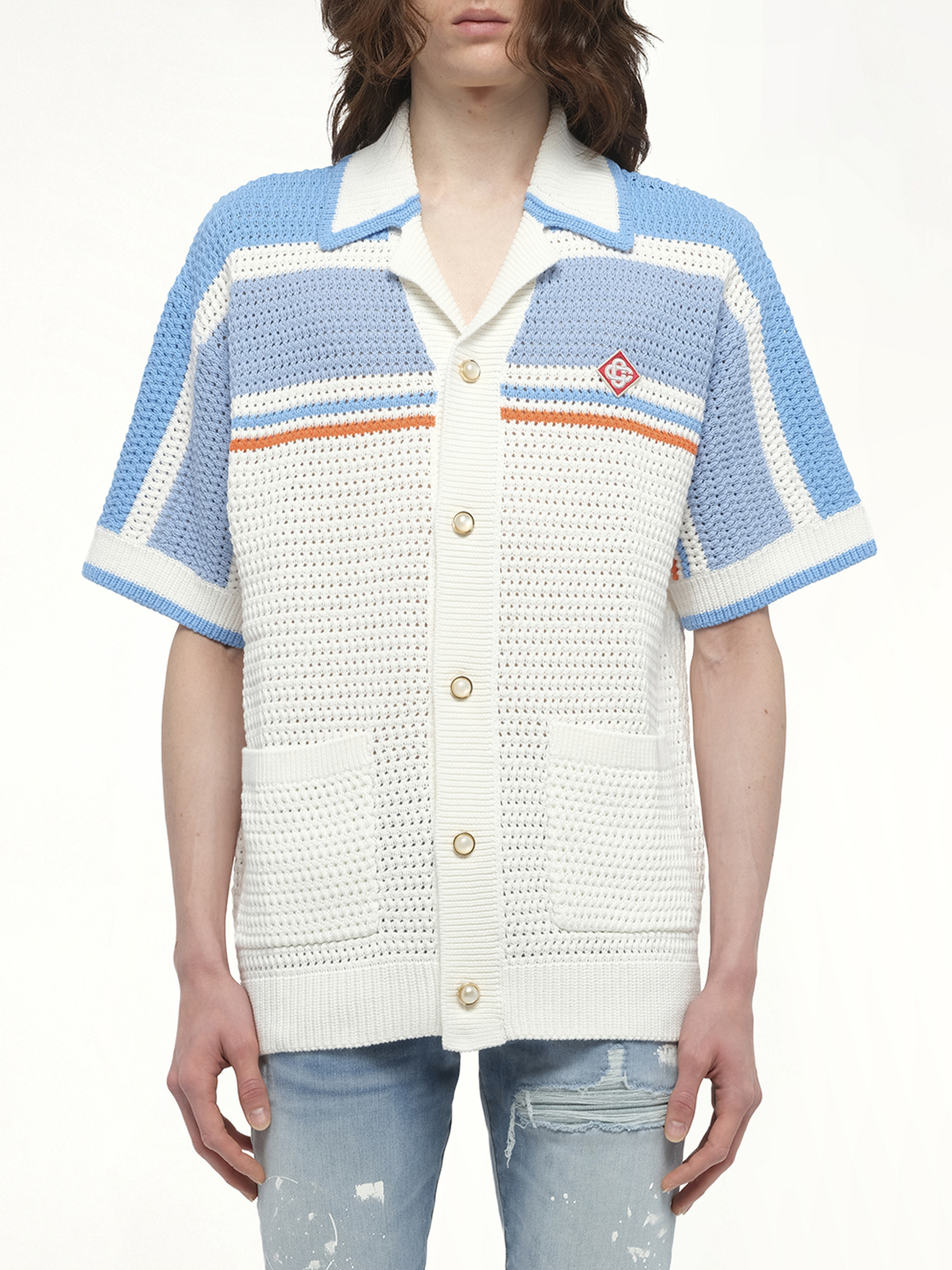 CASABLANCA's Faux Crochet Shirt in Blue is a stylish and versatile piece that adds a touch of elegance to any wardrobe. Perfect for both casual and formal occasions, this shirt is designed to make a statement. - Vibrant blue colour - Intricate faux crochet design - Relaxed fit for comfort - Button-down front - Short sleeves - Made in China Model is 187 cm and wears size M SKU: MPF25KW99701