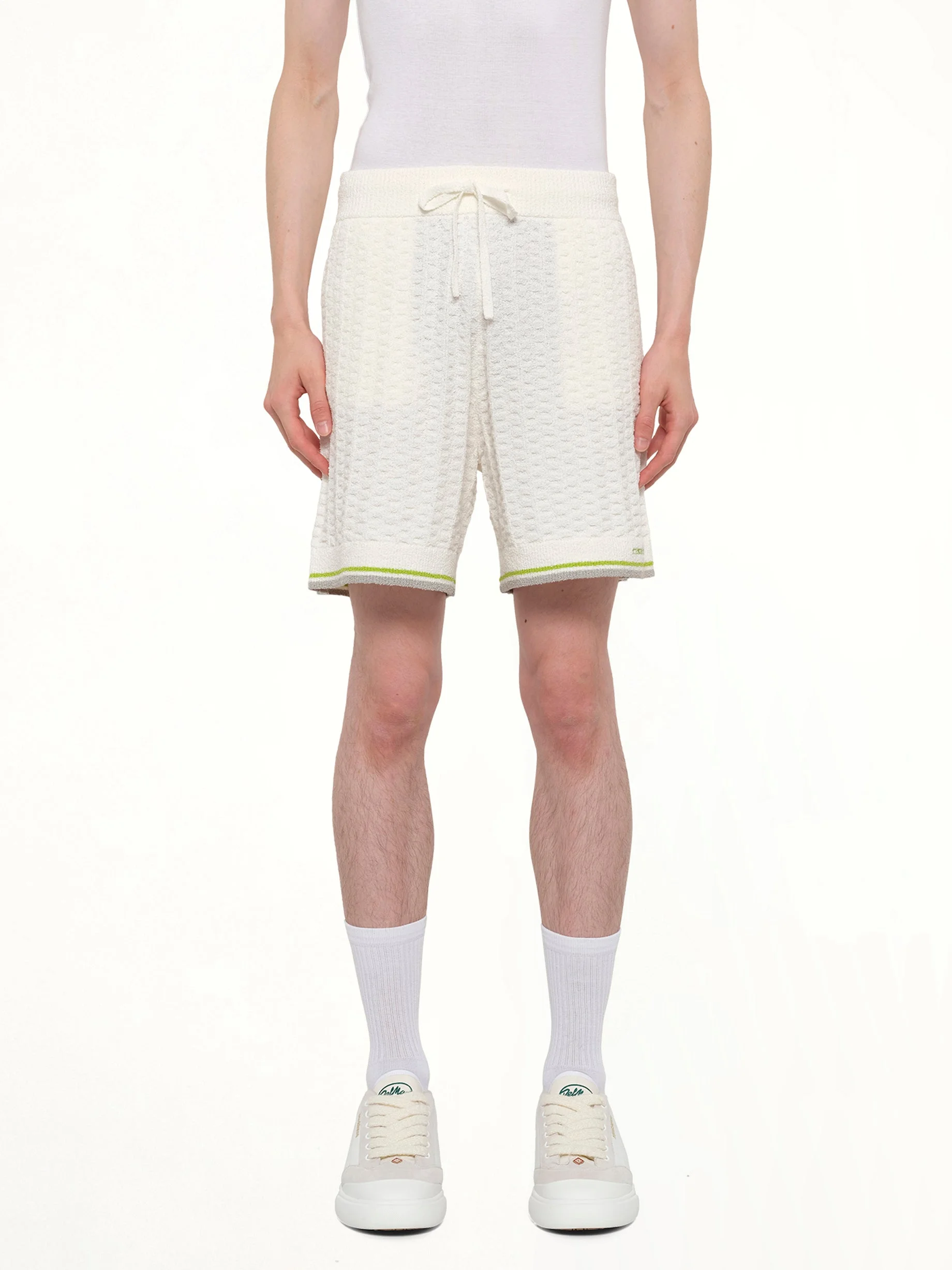 Casablanca's Tennis Boucle Shorts in White is a stylish and comfortable addition to your athletic wardrobe. Perfect for both on and off the court, these shorts offer a blend of elegance and functionality. - Composition: Cotton Blend - Classic white color for a timeless look - Designed for optimal movement and comfort - Features an elastic waistband for a secure fit - Ideal for tennis or casual wear - Made in China Model is 187 cm and wears size M SKU: M-SP26-KW-1216-01