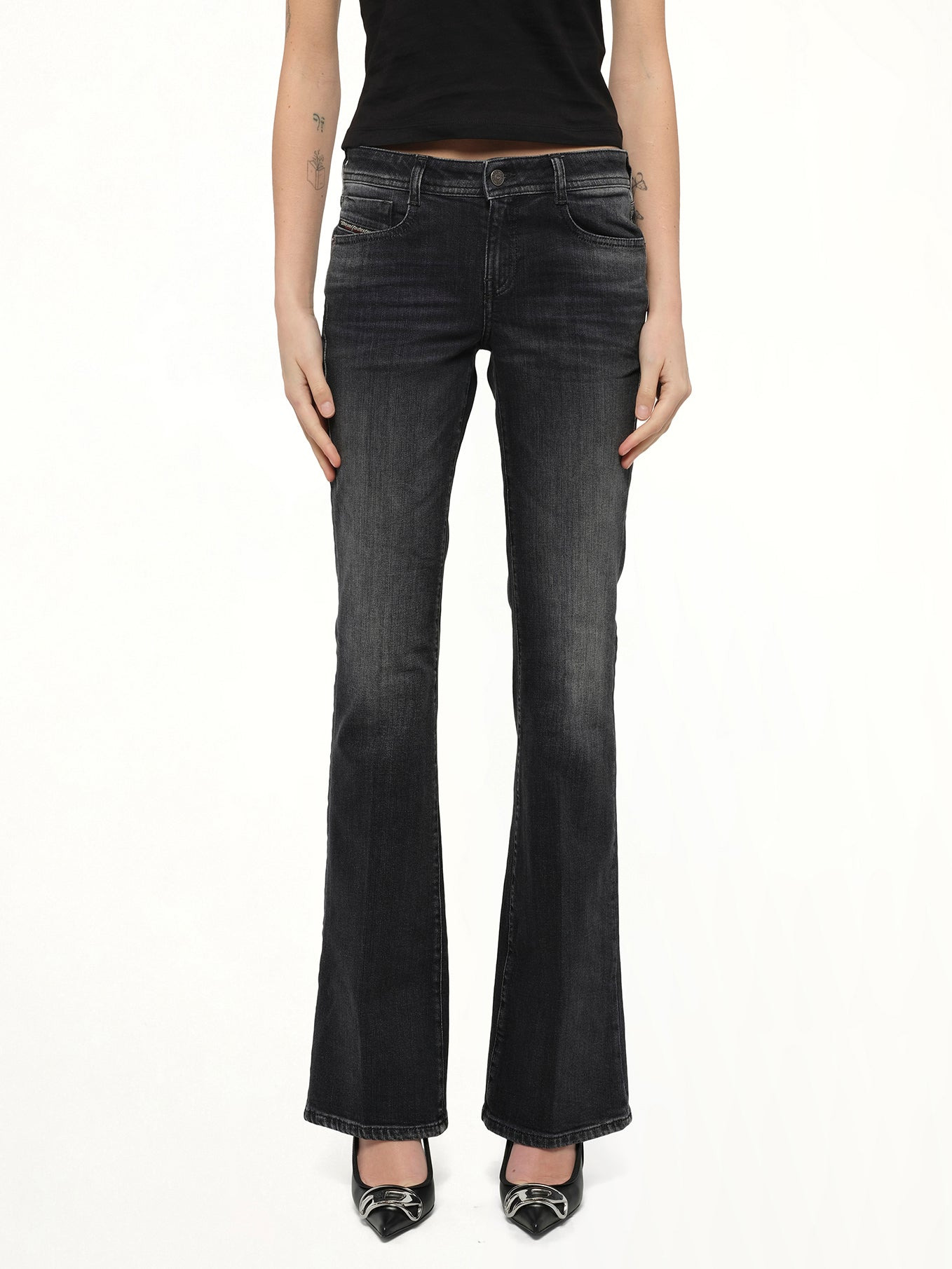 Diesel's 1969 D-EBBEY Bootcut Jeans in Black/Dark Grey is a stylish and versatile addition to any wardrobe. These jeans offer a classic bootcut fit that complements a variety of looks. - Composition: 98%Cotton 2%Elastane-Spandex - Classic bootcut silhouette - Black/Dark Grey color for versatile styling - Five-pocket design - Button and zip fly closure - Subtle fading and whiskering details - Made in N/A Model is 178 cm and wears size 27 SKU: A1100309L98 02