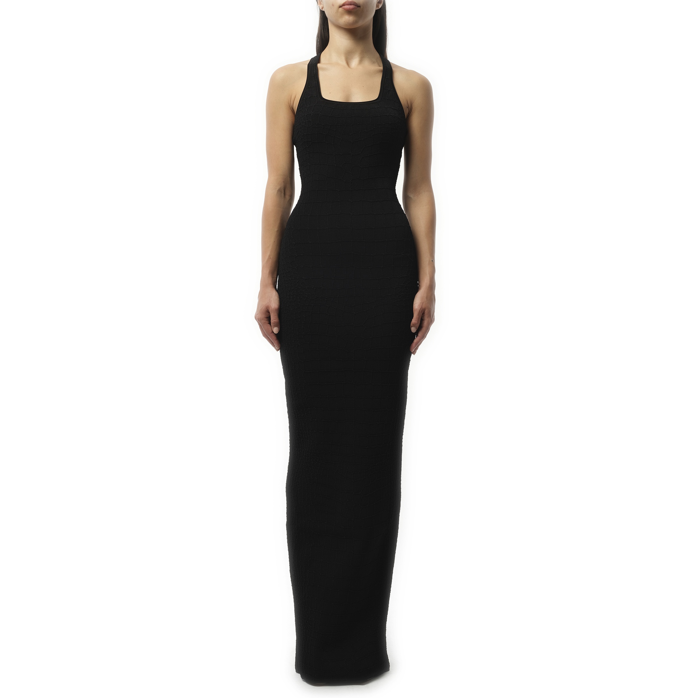 Jacquemus' La Robe Scala in Black is a sculptural sleeveless dress made from stretch viscose with a crocodile-effect texture. This maxi silhouette features clean lines and a racerback that flatters the frame. A modern and refined piece that brings minimalist elegance to any wardrobe. Composition: 72% viscose, 25% polyamide, 3% elastane Square neckline Sleeveless cut Racerback design Crocodile-effect texture Side zipper fastening Long back slit Made in Portugal Model is 175 cm and wears size 36. SKU: 251KN5722429 990