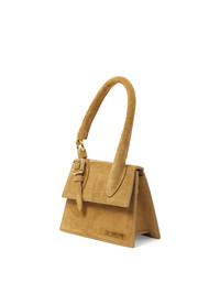 Jacquemus's Le Chiquito Moyen Boucle in Camel, a chic handbag made from leather. It features a magnetic flap closure, reinforced handle, and a gold metal buckle for a stylish yet practical design. This elegant bag combines luxury with everyday functionality. Magnetic flap closure Reinforced handle with gold metal buckle Long removable shoulder strap Engraved lobster clasp Made in Italy SKU: 233BA3273243 830