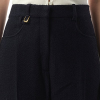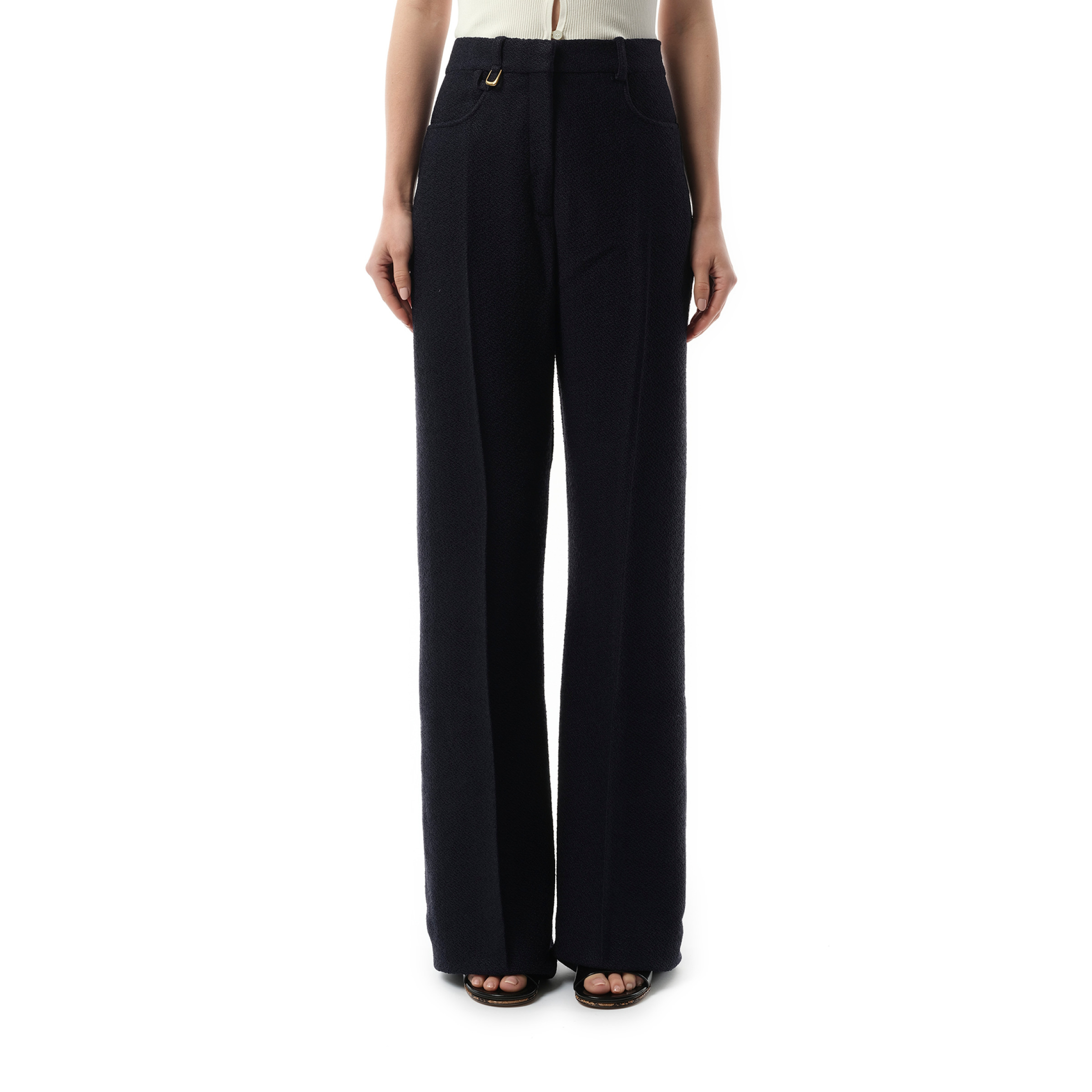 Experience ultimate comfort and style with Le Pantalon Sauge in Dark Navy. Made from high-quality materials, this pant offers a perfect fit and a sleek look. Designed to provide maximum comfort, it's a perfect addition to any wardrobe for any occasion. - Composition: 71% Viscose, 21% Virgin Wool, 8% Polyamide - Belt loops - Ring hardware detailing - Two rounded pockets to the sides - Pressed crease - Full-length - Concealed front button, hook and zip fastening Model is 175 cm and wears size 36 SKU: 243PA0031670 390