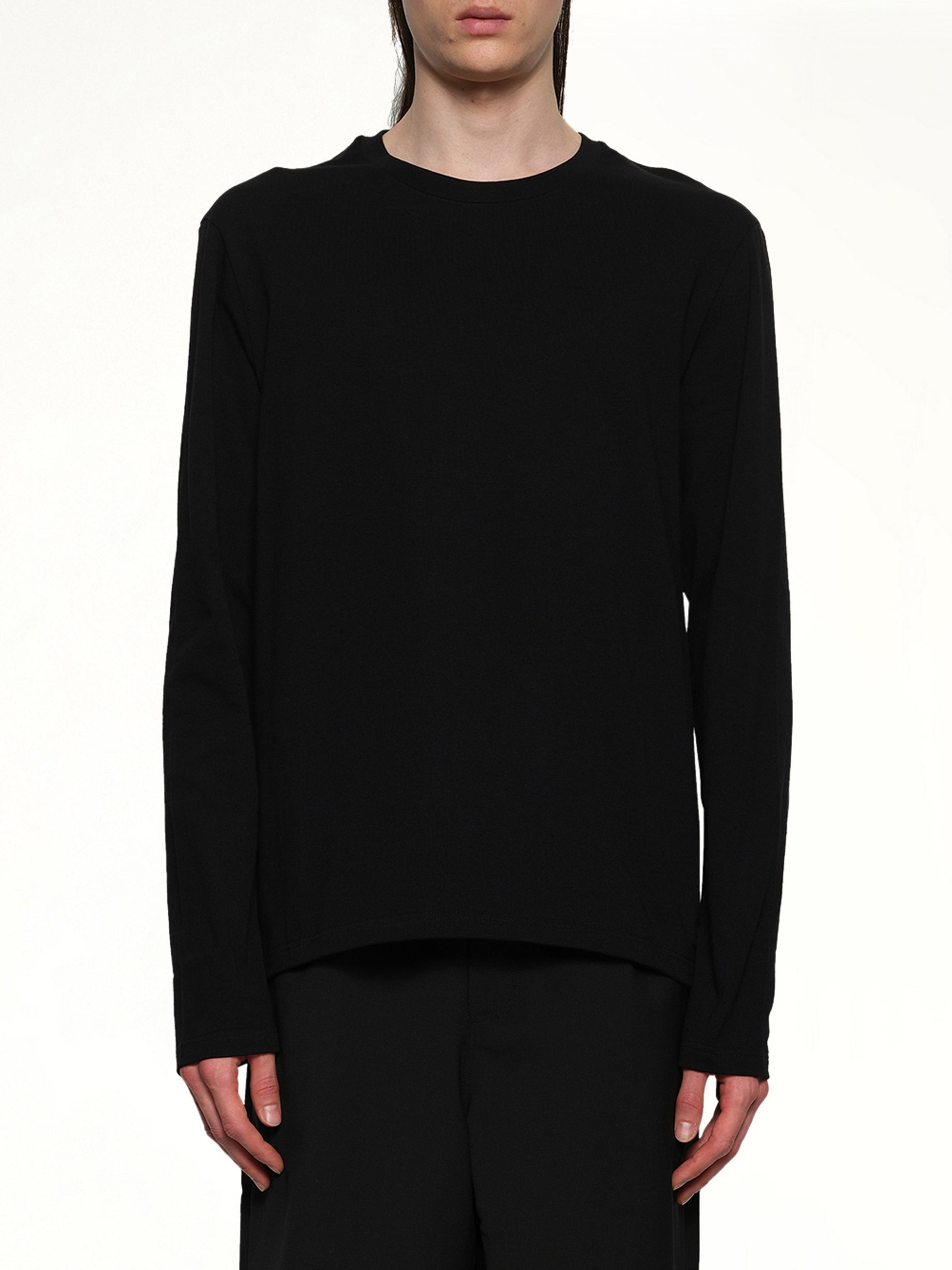 Jil Sander's Leather Patch Long Sleeve T-Shirt in Black is a sophisticated blend of casual and luxury fashion. This piece features unique leather patch detailing, adding a touch of elegance to a classic silhouette. - Composition: Primary Fabric: 100% Cotton - Secondary Fabric: 100% Cotton - Application: 100% Calf Leather - Color: Black - Long sleeves - Leather patch detailing - Round neckline - Relaxed fit - Made in: ITALY Model is 187 cm and wears size S SKU: J47GC0159J20103 001
