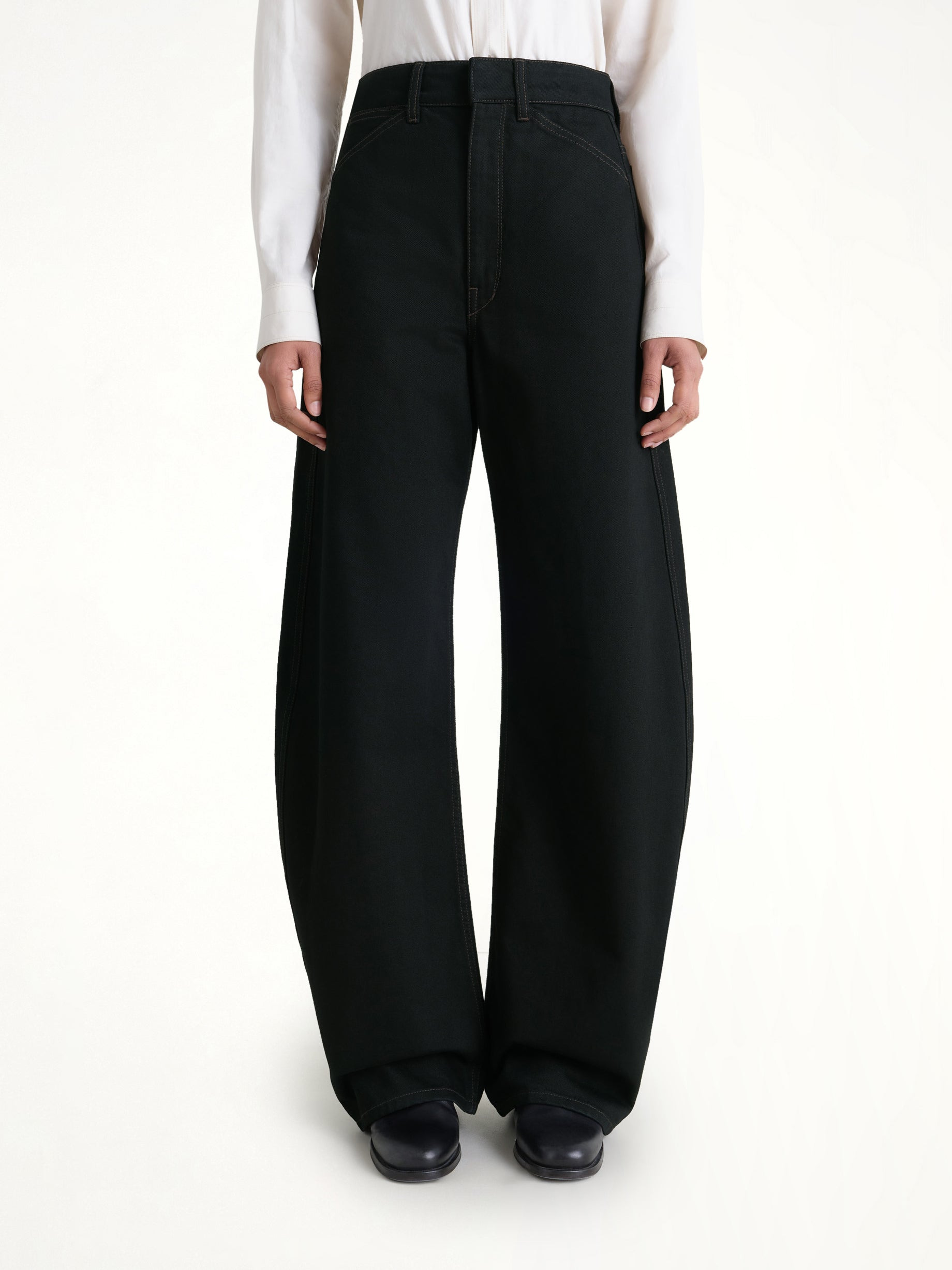 Lemaire's High Waisted Curved Pants in Black is a sophisticated addition to any wardrobe, offering a modern silhouette with a timeless appeal. These pants are designed to provide both comfort and style, making them perfect for various occasions. - Composition: Main fabric: 100% cotton Main lining: 100% cotton - High-waisted design for a flattering fit - Curved leg for a unique and contemporary look - Versatile black color suitable for any outfit - Tailored for a sleek and polished appearance - Functional pockets for added convenience - Made in - SKU: PA1264LD1055 BK999