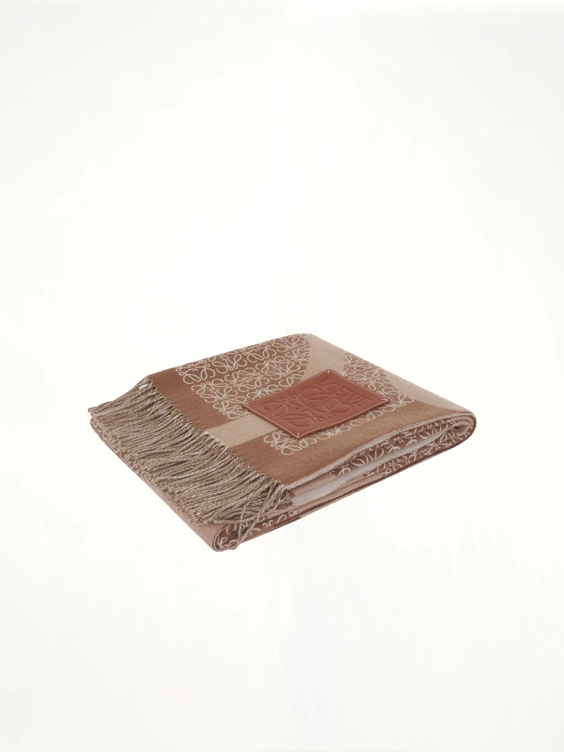Anagram wool blanket in camel with repeat anagram pattern, contrast loewe l motif and embossed loewe anagram calfskin patch - Composition: 100% Mohair - Repeat Anagram pattern - Contrast LOEWE L motif - Fringed edges - Embossed LOEWE Anagram calfskin patch SKU: K000230X33 3150
