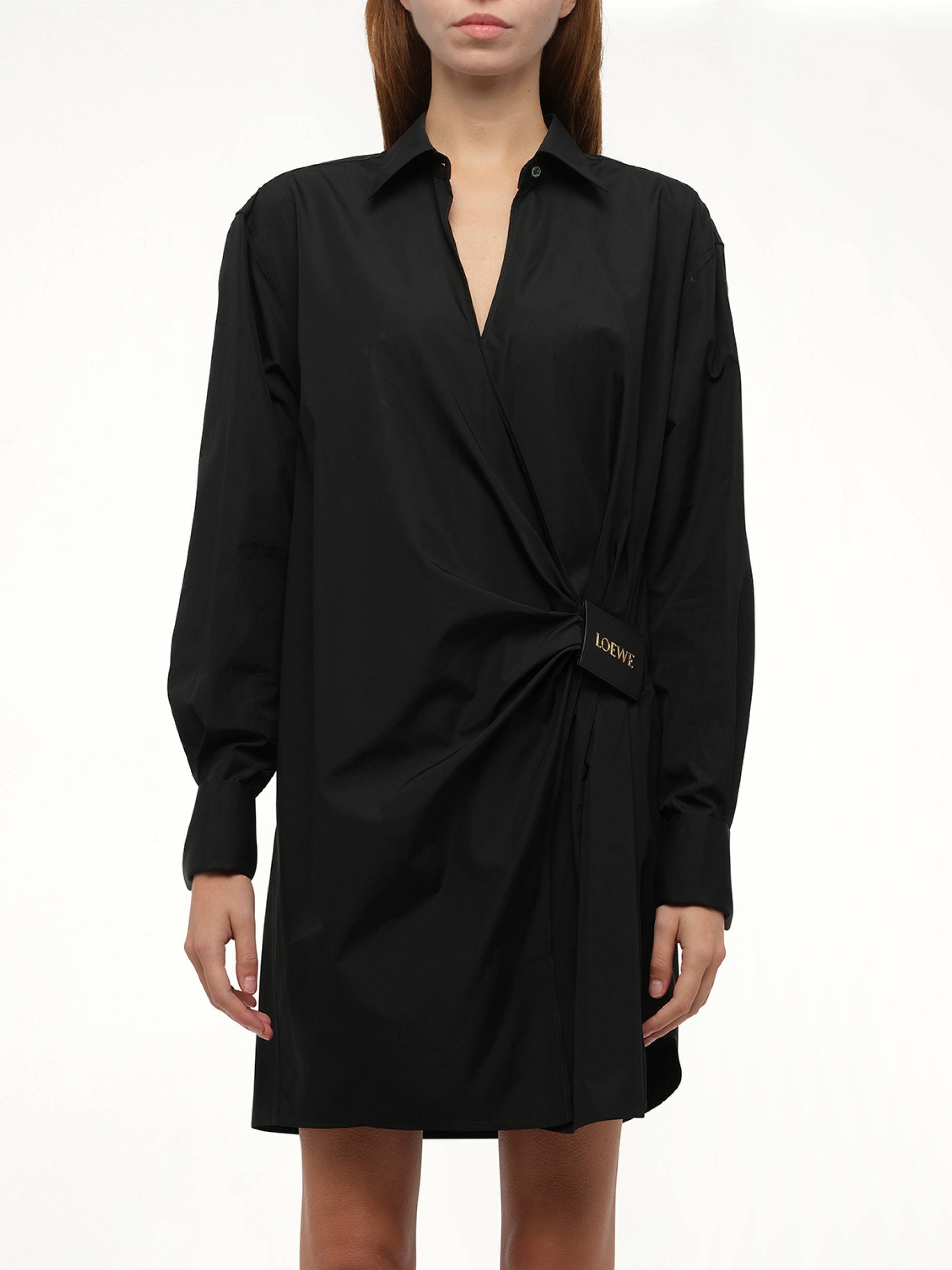 Loewe's Draped Shirt Dress in Black, a modern take on a classic shirt dress with flowing, dramatic draping for an elegant silhouette. This versatile piece offers a polished yet relaxed vibe, ideal for layering or wearing on its own. A sophisticated addition to your wardrobe, blending style and comfort. - Composition: 100% Cotton - Loose, draped fit that flatters the body - Button-down front with a relaxed collar - Elegant, versatile design suitable for various occasions - Made in Italy Model is 175 cm and wears size 36 SKU: S540Y09XSN 1100