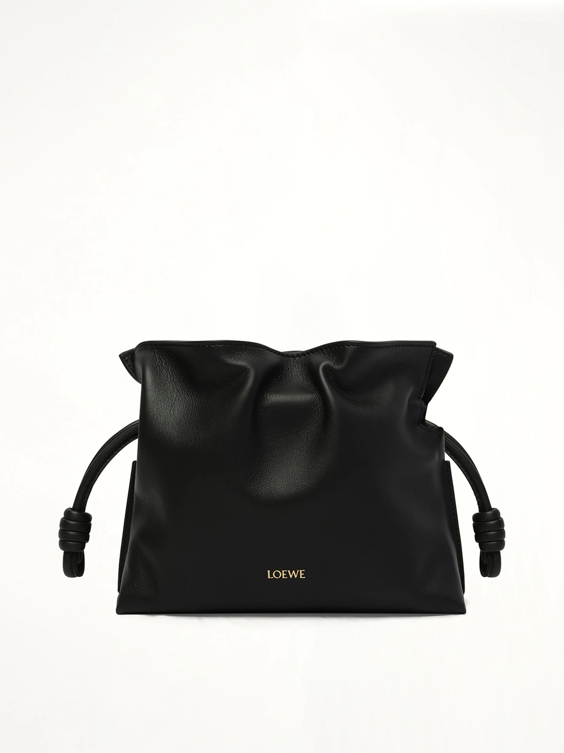 LOEWE's Flamenco Clutch Medium in Black is a sophisticated accessory that combines elegance with functionality. Its sleek design and versatile style make it a perfect addition to any wardrobe. - Composition: Exterior: 100.0% Vacuno-Calf Skin Interior: 40.0% Vacuno-Calf Skin 60.0% Vacuno-Calf Split - Features a drawstring closure with signature knot details - Spacious interior for essentials - Crafted with high-quality materials for durability - Can be carried as a clutch or worn over the shoulder - Timeless black color for versatile styling - Made in Spain SKU: A411FC1XD4 1100