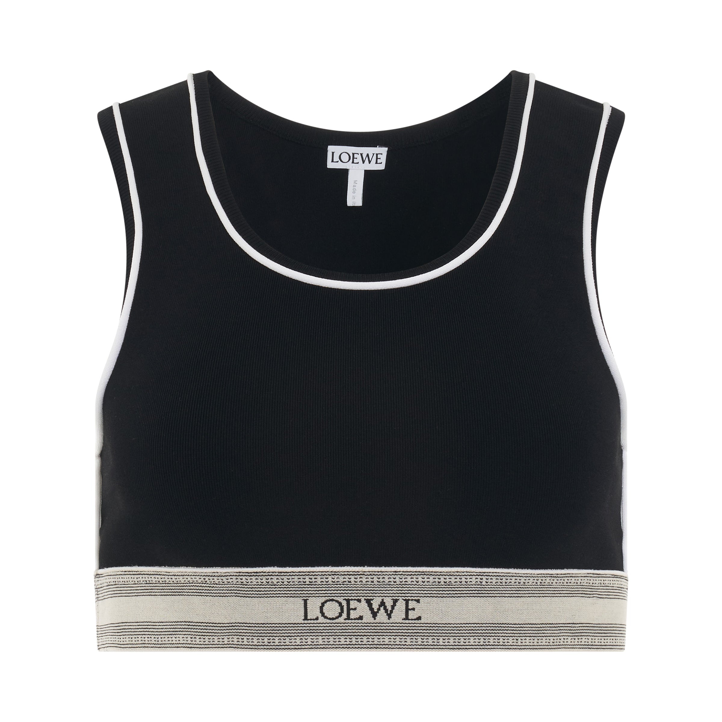 LOEWE Tank top crafted in lightweight compact viscose knit •Composition: Polyester 12%, Polyamide 12.8%, Viscose 56%, Elastane 7.2%, Cotton 12% •Black •Slim fit •Cropped length •LOEWE jacquard elasticated band •Contrast piping at the edges SKU: S359Y14KC7 1100