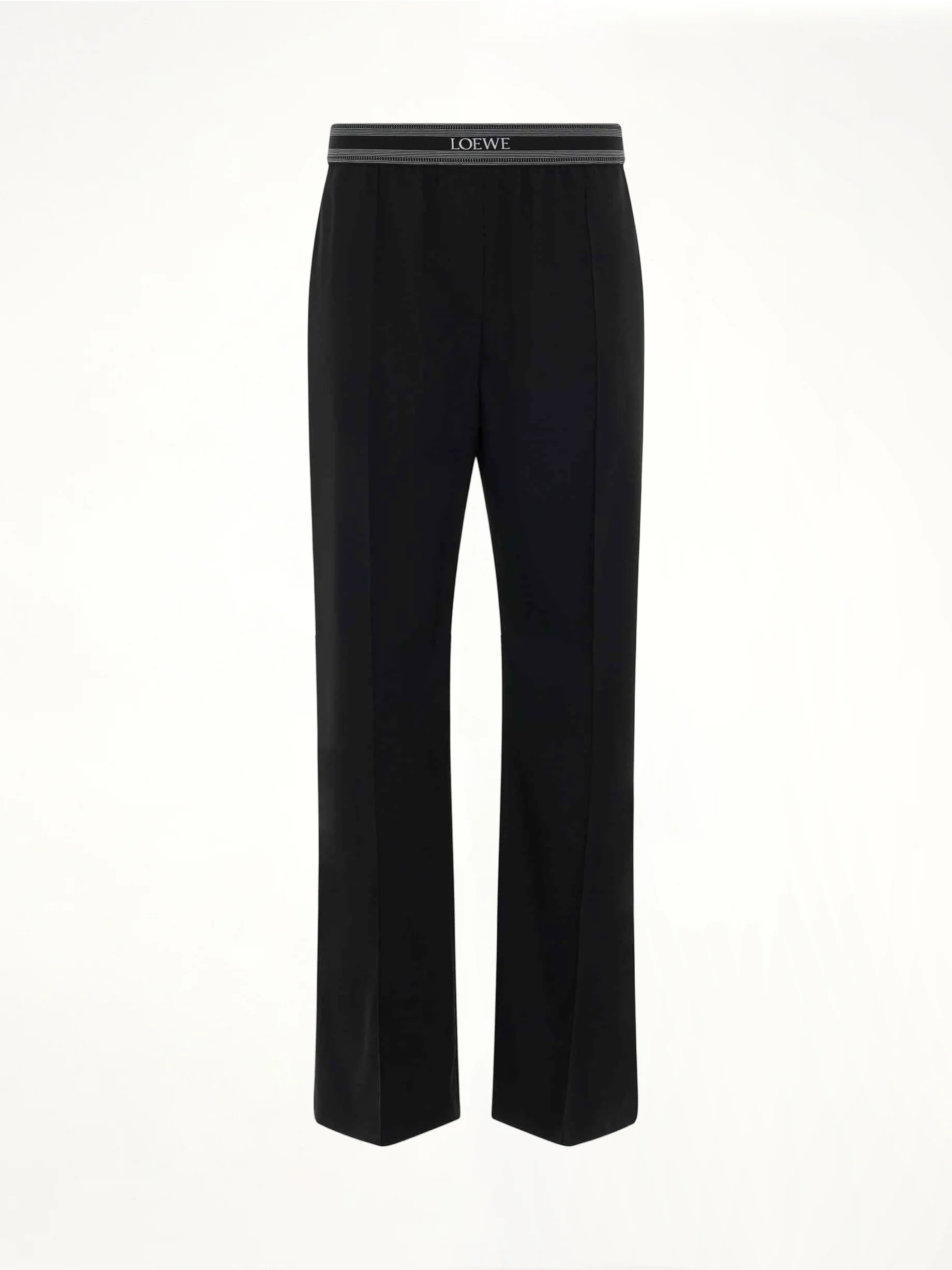 LOEWE Trousers crafted in lightweight fluid tailoring wool •Composition Exterior: Wool, Polyester Interior: Cotton •Relaxed fit •Long length •Mid waist •Straight leg •LOEWE jacquard elasticated waistband •Slash pockets •Patch pocket at the back •Stitched crease SKU: S359Y04XBP 1100