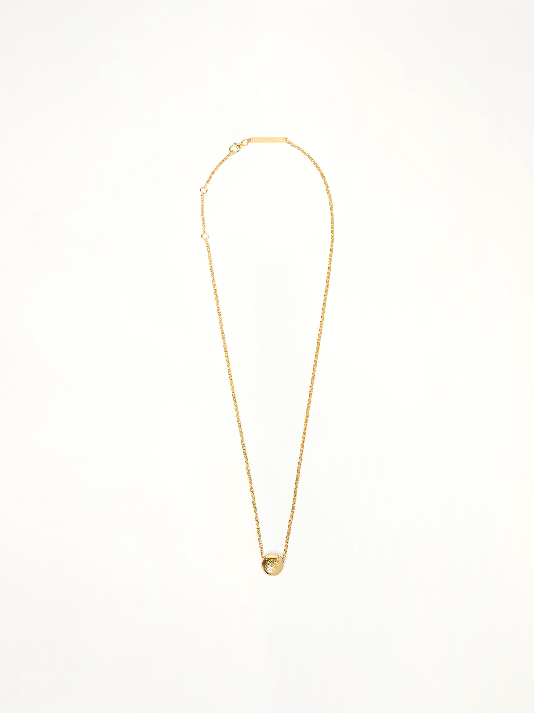 Loewe's Pebble Pendant Necklace in Gold is a stunning accessory that adds a touch of elegance to any outfit. Its unique design and luxurious finish make it a must-have for fashion enthusiasts. - Composition: Exterior: 100.0% Sterling Silver-Plata De Ley 925 - Features a distinctive pebble-shaped pendant - Elegant gold-tone finish - Adjustable chain for versatile wear - Perfect for both casual and formal occasions - Signature Loewe craftsmanship - Made in Italy Model is 178 cm and wears size OS SKU: JJ07241X03 8130