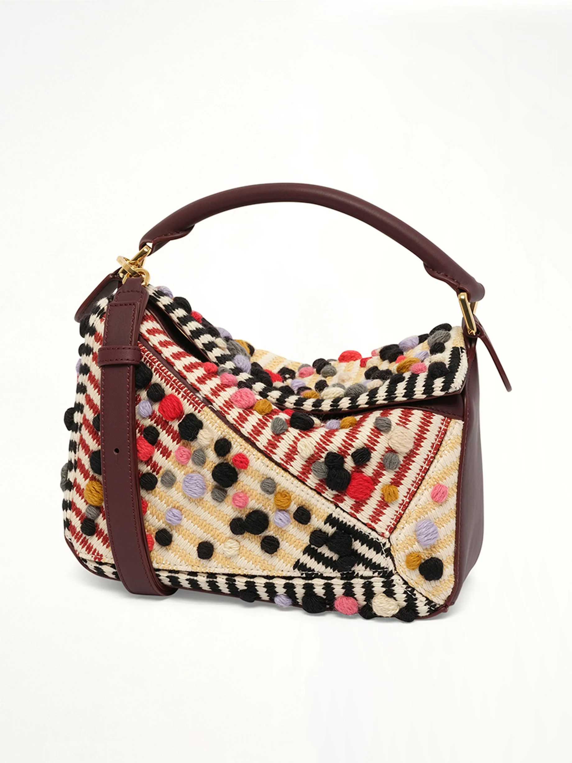 Loewe's Puzzle S Dotted in Natural/Multicolor is a sophisticated and versatile handbag that combines innovative design with playful aesthetics. This piece is perfect for adding a touch of elegance and color to any outfit. - Composition: Exterior: 20.0% VACUNO-CALF SKIN 20.0% LANA-WOOL 60.0% ALGODON-COTTON Interior: 3.8% POLIAMIDA-POLYAMIDE 90.0% CORDERO-LAMBSKIN 6.2% ALGODON-COTTON - Features a unique geometric design with dotted patterns. - Comes with an adjustable and removable shoulder strap for versatile carrying options. - Includes a top handle for easy hand carrying. - Equipped with a secure zip closure to keep your belongings safe. - Offers a spacious interior with a pocket for organization. - Made in Spain SKU: A510S21XCL 2668