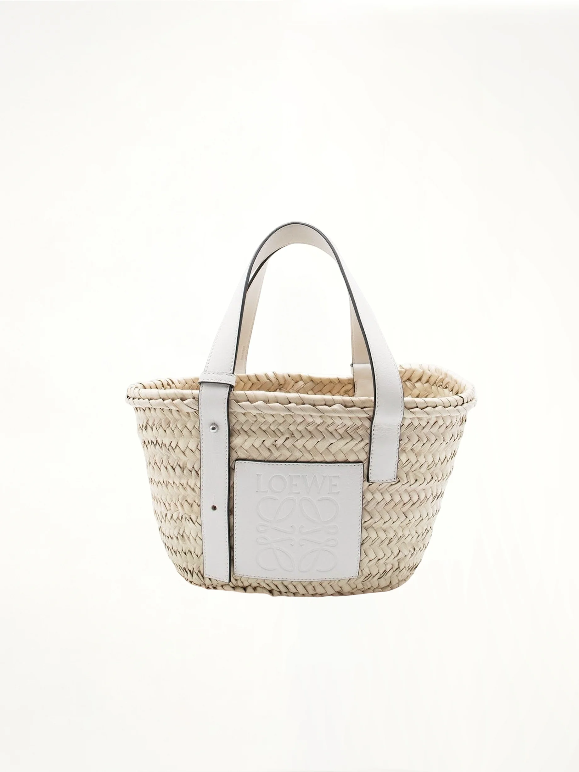 Small basket bag in handwoven palm leaves with an adjustable top handle and embossed Loewe Anagram patch on front • Composition: 100% Calfskin Leather, 100% Palm leaves • Embossed Loewe Anagram patch • Adjustable top handle • Dimensions (cm): 17 x 33 x 13 SKU: A223S93X04 2163