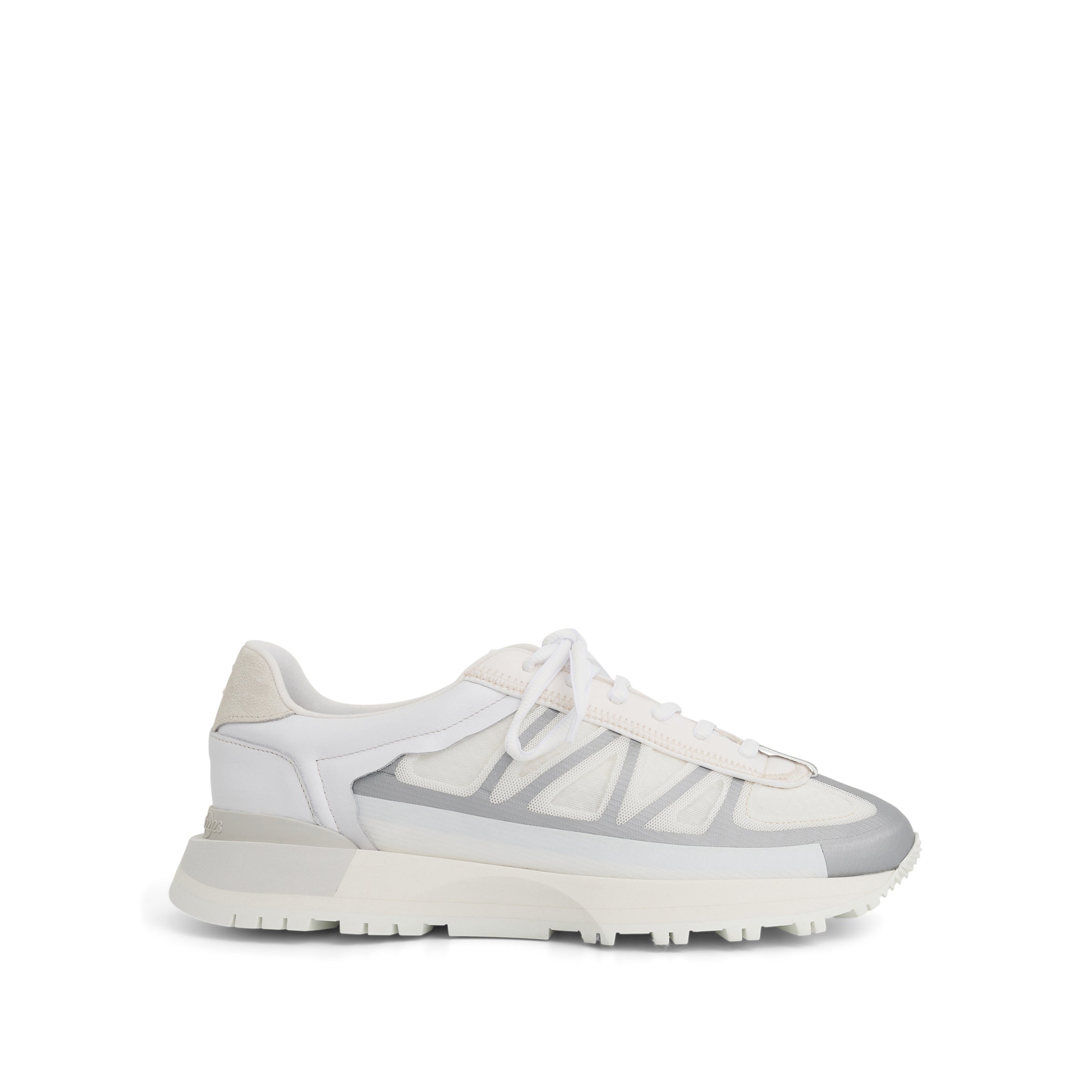 Maison Margiela 50-50 lace-up sneakers in calf leather •Composition Sole: Rubber 100% Outer: Calf Leather 100%, Fabric 100% Lining: Fabric 100% •White •Silver-tone •Mesh panelling •Layered details •Logo patch at the tongue •Embossed logo to the rear •Round toe •Lace-up fastening •Ridged rubber sole SKU: S57WS0444P5064 H9405