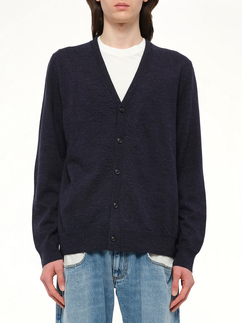 Maison Margiela's Gauge 12 Elbow Patch Cardigan in Navy is a sophisticated addition to any wardrobe, offering both style and comfort. This cardigan features a classic design with modern details, making it a versatile piece for various occasions. - Composition: Primary Fabric: 100% Wool - Application: 100% Calf Leather - Classic navy color for timeless appeal - Elbow patches for added durability and style - Gauge 12 knit for a refined texture - Button-up front for easy layering - Ribbed cuffs and hem for a snug fit - Made in N/A Model is 187 cm and wears size M SKU: S50HP0027M13098 511M