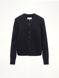 Maison Margiela's Gauge 5 Cardigan in Navy/Dark Brown is a sophisticated layering piece that combines classic style with modern design. This versatile cardigan is perfect for adding a touch of elegance to any outfit. - Composition: Primary Fabric: 90% Virgin Wool 10% Polyamide-Nylon - Features a two-tone color scheme in navy and dark brown - Designed with a relaxed fit for comfort - Button-up front closure for easy wear - Ribbed cuffs and hem for a refined finish - Signature Maison Margiela stitching detail - Made in N/A Model is 178 cm and wears size S SKU: S51HP0023M13154 002F
