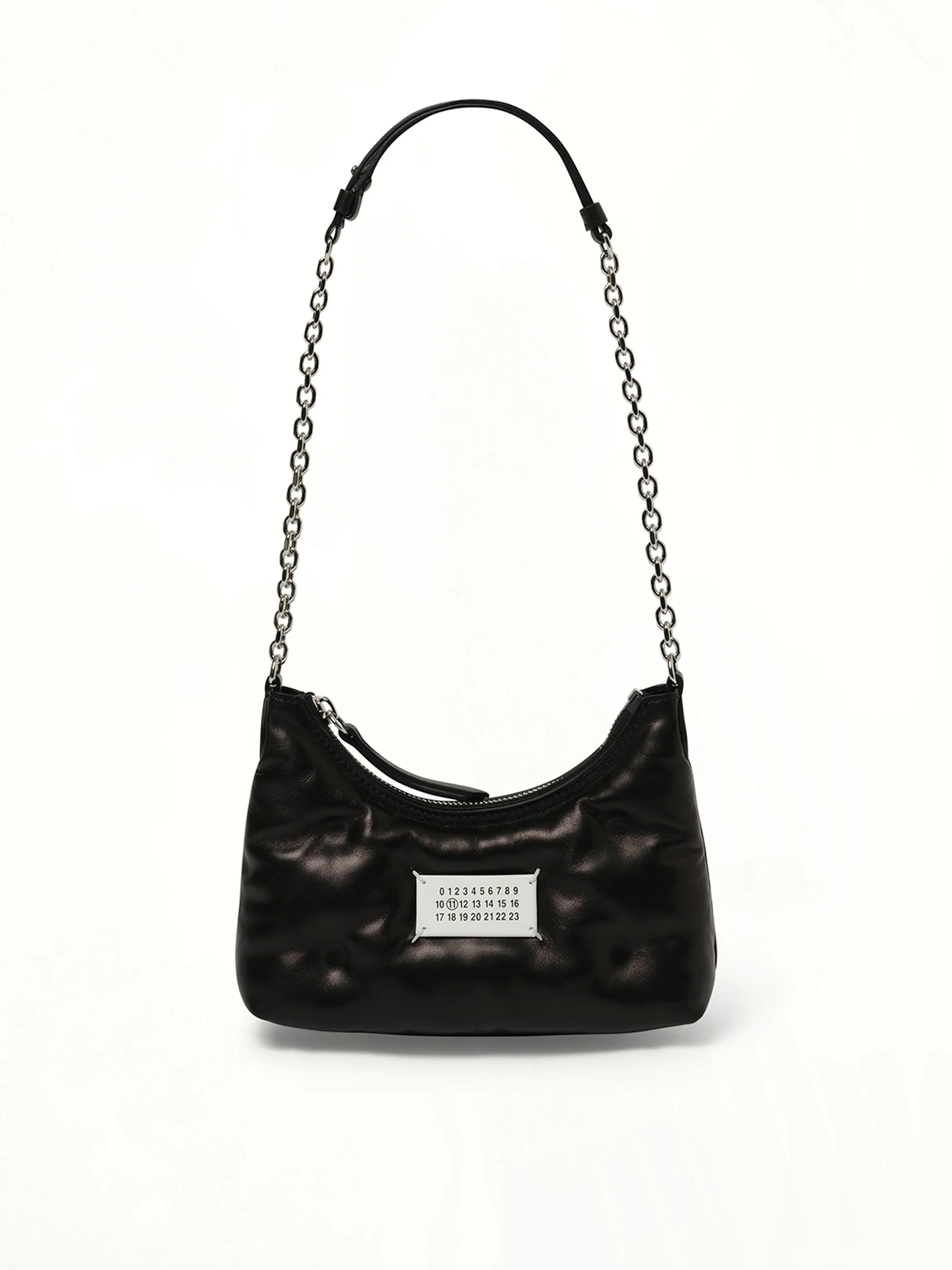 Expertly crafted with sleek black leather, the Micro Glam Slam Hobo Bag offers a luxurious and versatile addition to your wardrobe. Its micro size makes it perfect for on-the-go essentials while its hobo design gives a modern and chic touch. - Composition: 100% Calf Leather - Signature numbers motif - Top zip fastening - Adjustable leather and chain-link shoulder strap - Main compartment - Made in Italy SKU: SB1WG0021P4300 T8013