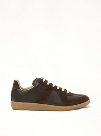 Maison Margiela's Replica Leather Sneaker in Dark Khaki is a sophisticated blend of classic design and modern style. These sneakers offer a versatile look that complements both casual and semi-formal outfits. - Composition: Upper: 100% Calf Leather - Contrast: 100% Calf Leather - Lining: 100% Cotton - Contrast: 100% Calf Leather - Inside: 100% Calf Leather - Sole: 100% Rubber - Dark Brown colour for a timeless appeal - Signature Maison Margiela branding - Comfortable fit with a cushioned insole - Durable rubber sole for enhanced traction - Lace-up closure for a secure fit Made in Italy SKU: S58WS0109P1895 T2153
