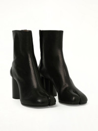 Step out in style with these Tabi Ankle Boots in black. Crafted from soft nappa leather, these ankle boots feature a unique 8cm cylindrical heel and the iconic Tabi split-toe shape. Inspired by the traditional Japanese sock from the 15th century, these boots capture the avant-garde and rebellious spirit of the Maison Margiela. - Composition: Lining: 100% Calf Leather - 8cm cylindrical heel - Tabi split-toe shape - Concealed side fastening - Finishing with single stitch moniker at the back SKU: S58WU0260P3753 T8013