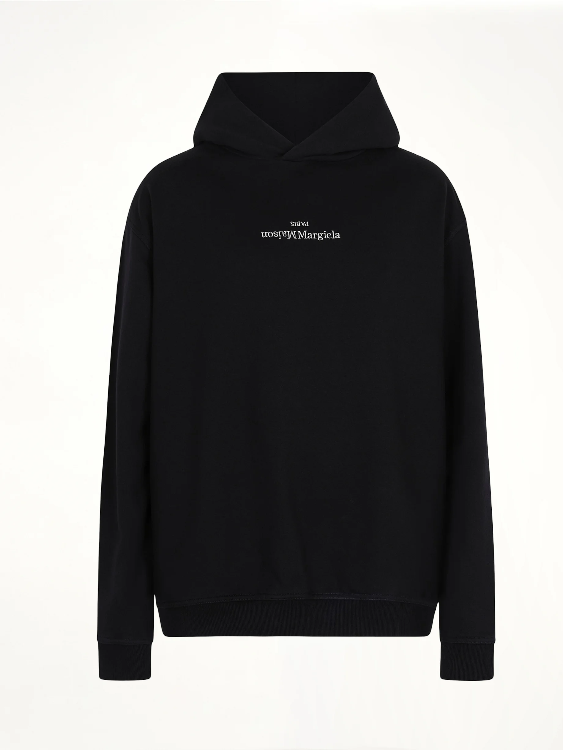 Maison Margiela's Upside Down Logo Hoodie in Black is a unique and stylish addition to any wardrobe. This hoodie features a distinctive design that sets it apart from traditional styles. - Composition: 100% Cotton Classic hood Drop shoulder Ribbed cuffs Straight hem - - Upside down logo print for a bold statement - Relaxed fit for comfort and ease - Drawstring hood for adjustable coverage - Kangaroo pocket for practicality - Ribbed cuffs and hem for a snug fit - Model is 187 cm and wears size M SKU: S50GU0167S25503 962