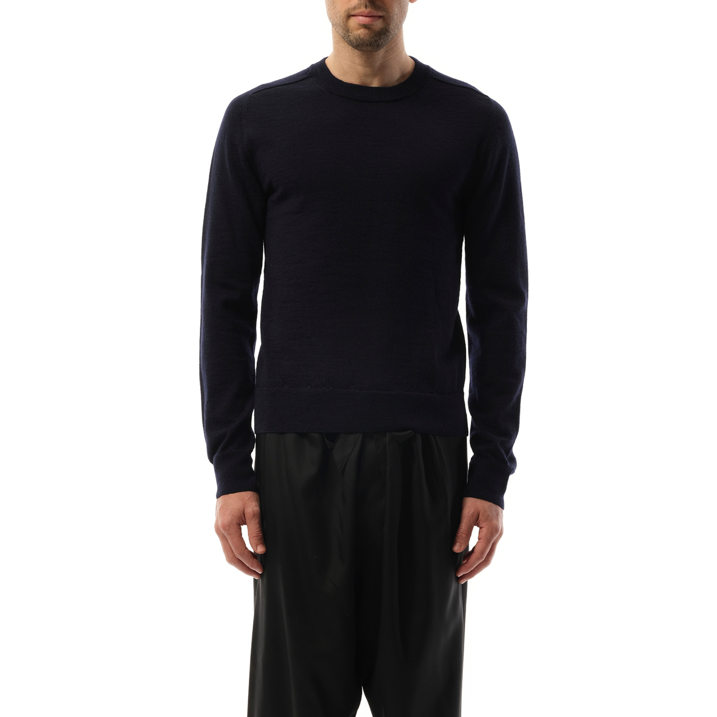Expertly crafted from luxurious wool, our Wool Crewneck Sweater in Dark Blue combines style and warmth. Perfect for any occasion, this sweater is sure to become a staple in your wardrobe. Stay cozy and chic all season long with our high-quality sweater. - Composition: 100% Wool - Knitted construction - Crew neck - Long sleeves - Ribbed trim - Straight hem Model is 175 cm and wears size M SKU: S50HL0041M13098 524M