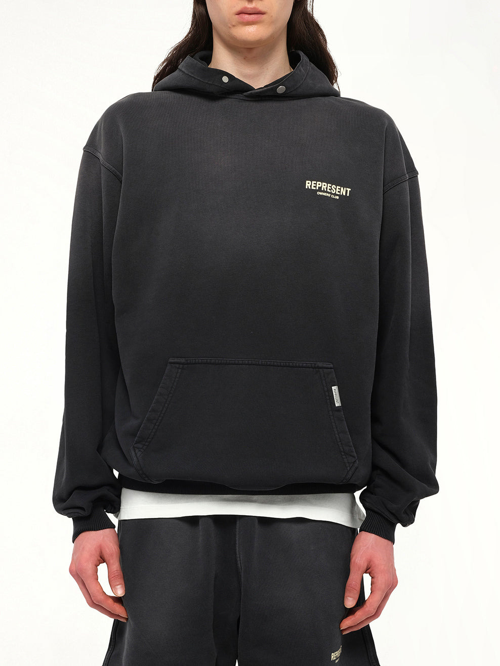 Represent's Represent Owners Club Hoodie in Aged Black is a stylish and comfortable addition to any wardrobe. This hoodie features a unique aged black finish, offering a vintage look with modern appeal. - Composition: 100% Cotton - Classic pullover design - Adjustable drawstring hood - Kangaroo front pocket - Ribbed cuffs and hem - Embroidered Represent Owners Club logo - Made in - Model is 187 cm and wears size M SKU: OCM41113 0330