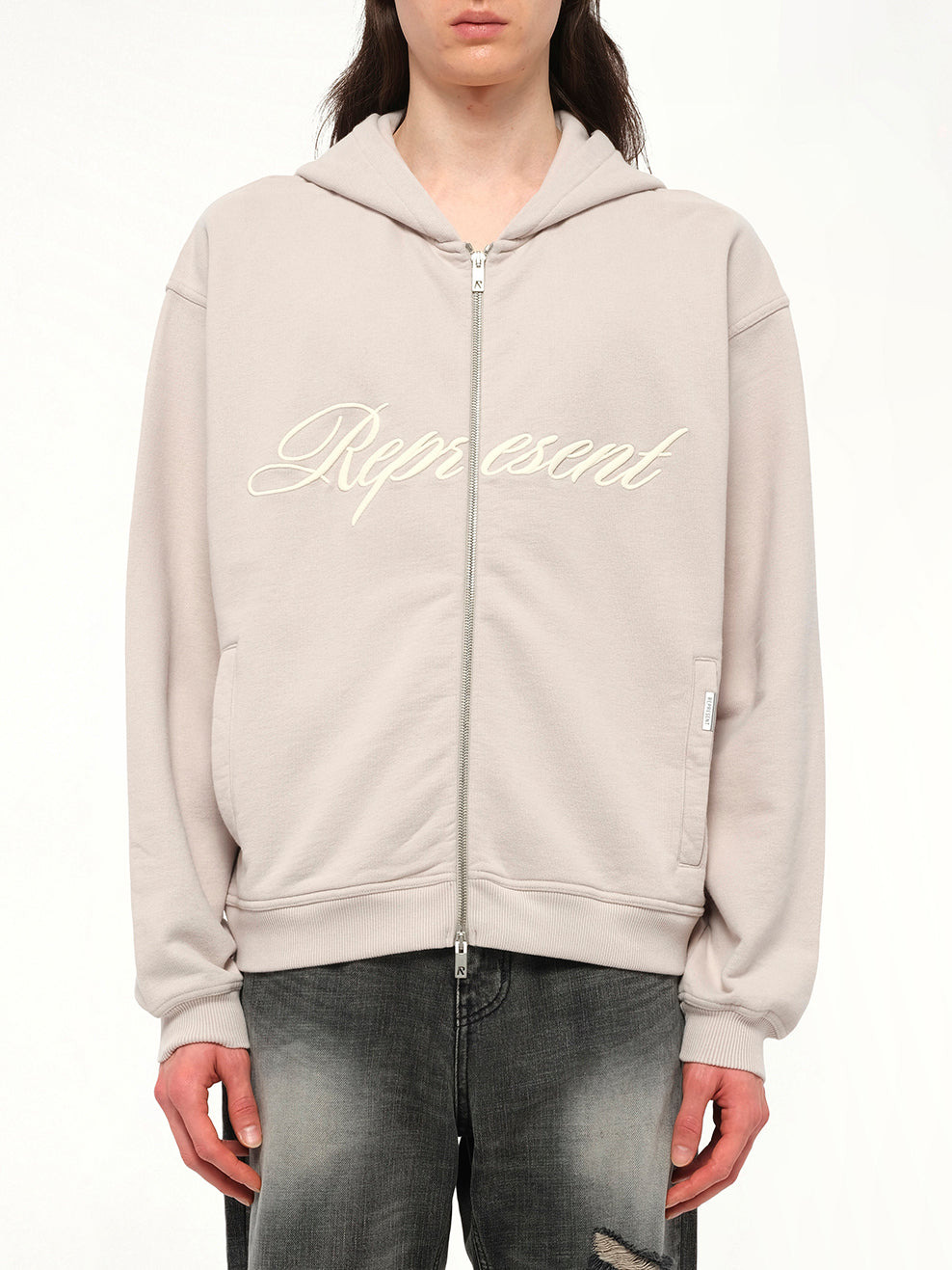 Represent's Script Logo Zip Hoodie in Concrete is a stylish and versatile addition to any wardrobe. This hoodie combines comfort with a modern aesthetic, making it perfect for everyday wear. - Composition: 100% Cotton - Features a full zip closure for easy layering. - Embellished with the iconic script logo on the chest. - Designed with a drawstring hood for adjustable coverage. - Includes front pockets for convenient storage. - Offers a relaxed fit for ultimate comfort. - Made in - Model is 187 cm and wears size M SKU: MLM100025 25