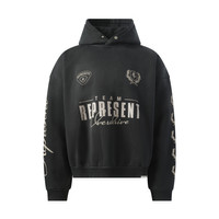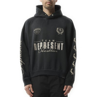 Represent's World Championship Hoodie in Stained Black offers a bold streetwear aesthetic with a premium oversized fit. Crafted from heavyweight cotton, this hoodie features unique fade-out spray finishes that make each piece one of a kind. An essential for a relaxed, contemporary street look. - Composition: 100% Cotton - Oversized, boxy fit with dropped shoulders - "World Championship" graphic on the front, back, and hood - Ribbed trims at cuffs and hem - Finished with Represent metal bar logo at the hem - Made in Portugal Model is 192 cm and wears size M. SKU: MLM41144 04
