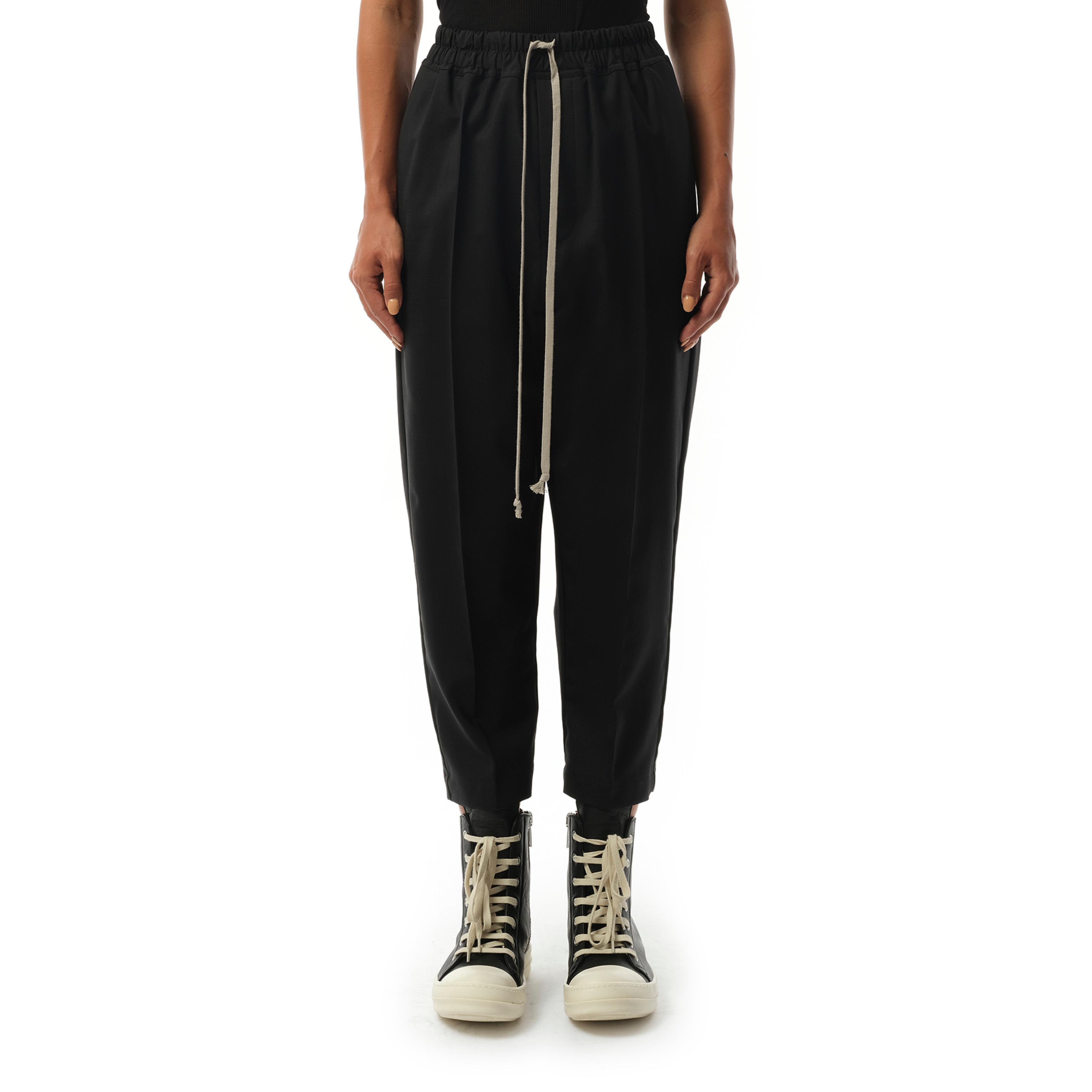 Update your wardrobe with the sophisticated yet comfortable Drawstring Astaires Cropped pants in Black. These stylish cropped pants feature a drawstring waist for a customizable fit. Made with high-quality materials, these pants are perfect for any occasion. - Composition: 96% New Wool, 4% Elastane - Above ankle length - Slightly dropped crotch - Elastic waistband with drawstring - Made in Italy Model is 175 cm and wears size 40 SKU: RP01E7303 ZL 09