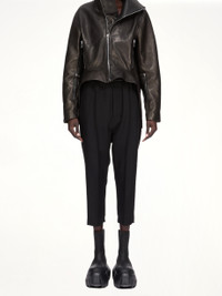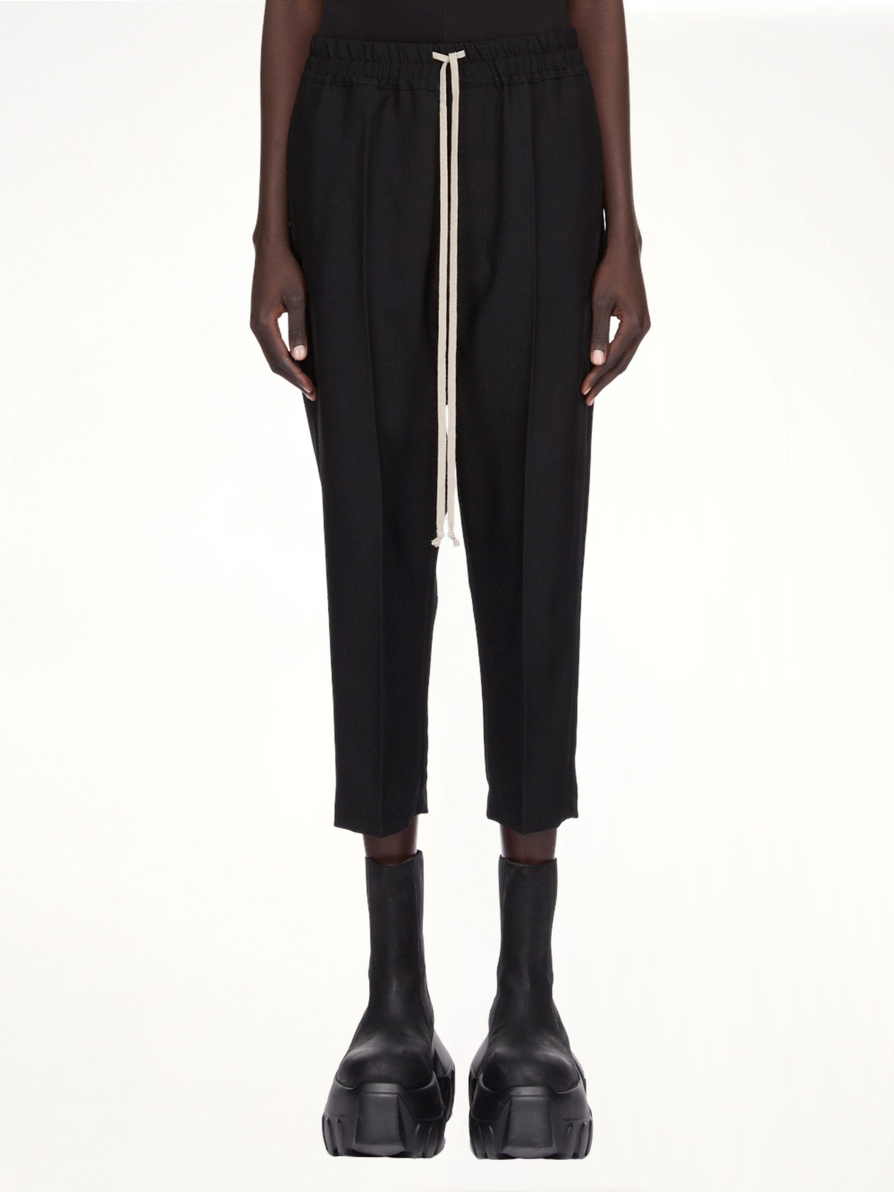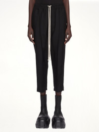Rick Owens's Drawstring Astaires Cropped in Black is a modern take on classic tailoring, offering a relaxed yet sophisticated silhouette. These trousers feature a unique cropped design, perfect for contemporary styling. - Composition: 100%New Wool-Buttons 100%Buffalo Horn - Relaxed fit with a drawstring waist for adjustable comfort - Cropped length for a modern, edgy look - Versatile black color suitable for various occasions - Signature Rick Owens design elements - Made in Italy SKU: RP02E4303 WGP 09